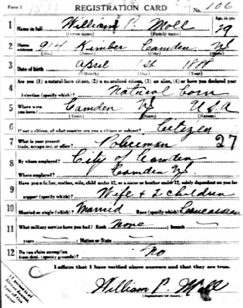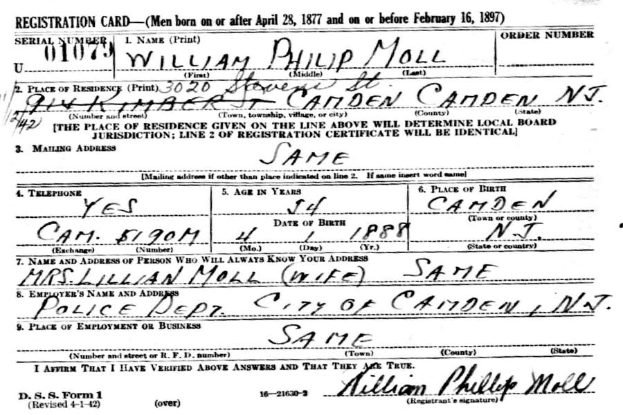 WILLIAM PHILIP MOLL was born on April 1, 1888 in Camden, New Jersey to Christopher and Anna Moll. He was the eighth of nine children. His father supported his family working as a butcher, and had brought his family to Camden from Philadelphia shortly after the 1880 Census enumeration. The family lived at 1166 Maple Street in the lat 1880s and early 1890s. The 1900 Census shows the family at 212 North Twelfth Street, and they still were living there in 1906. William Moll married around 1909, and when the 1910 Census was taken, his wife Lillian had bore a child, Elizabeth. The Moll's lived at 823 Pearl Street. William Moll then supported his family as a railroad brakeman. By 1914 and for many years thereafter William Moll lived at 914 Kimber Street in North Camden. The 1914 Camden City Directory shows him working as a fireman, but not in the firefighting sense of the word, however. William Moll's brother Christopher Moll Jr. did, however, have a long career with the Camden Fire Department, beginning in the mid-1920s. Another brother, Frank H. Moll, also served briefly with the Camden Police Department in the mid-1920s. By June of 1917 William Moll had found employment as a Camden police officer. Records indicate that his employ may have been interrupted, but not by military service, and he received a permanent appointment on January 1, 1920. Both the 1920 Census and 1930 Census shows him at the Kimber Street address with his wife Lillian, daughter Elizabeth, and a son, also named William, who was born April 29, 1907. By 1942 William Moll he had moved to 3020 Stevens Street in East Camden. He was still living at that address as late as the fall of 1959. William Moll was still with the Police Department as late as 1947. He retired and was receiving his pension by the beginning of 1949. |