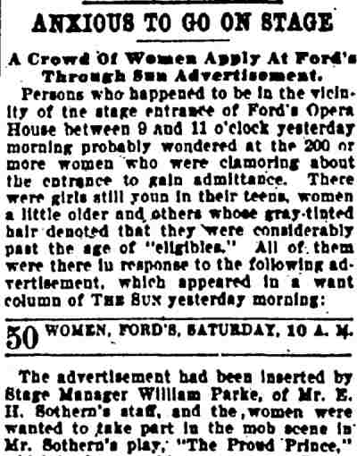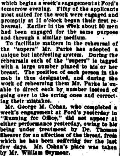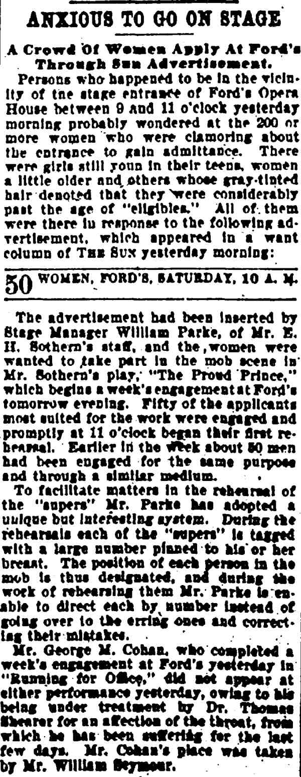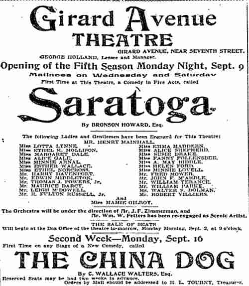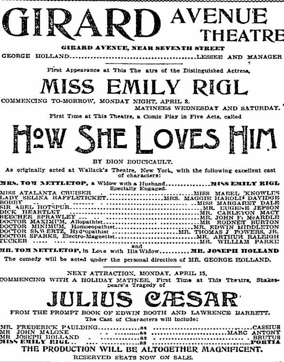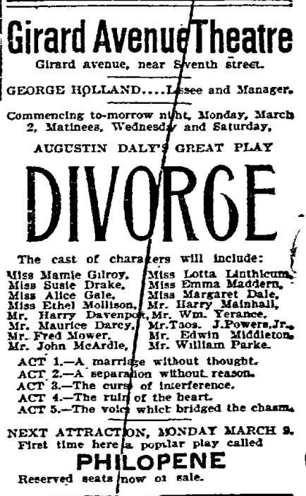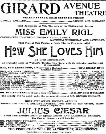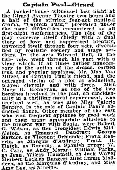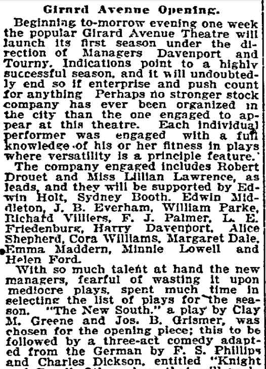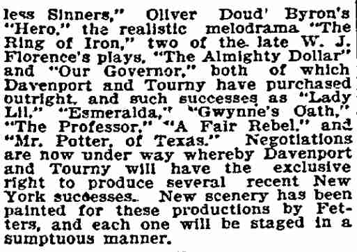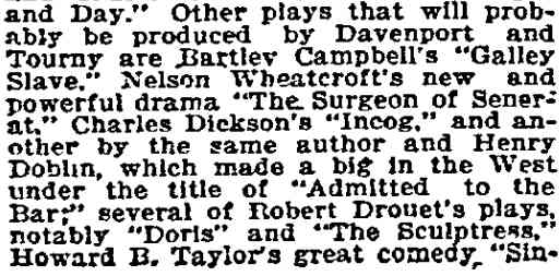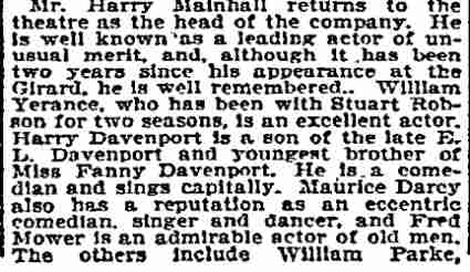 This play, set in France, ran on Broadway for 56 night. William Parke worked with E.H. Sothern in this show, who had employed him as a stage manager in his production of Hamlet. Also in the cast was a young Cecilia Loftus. |