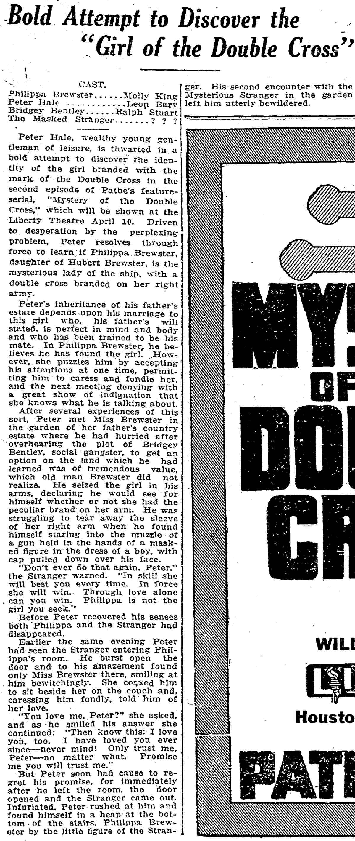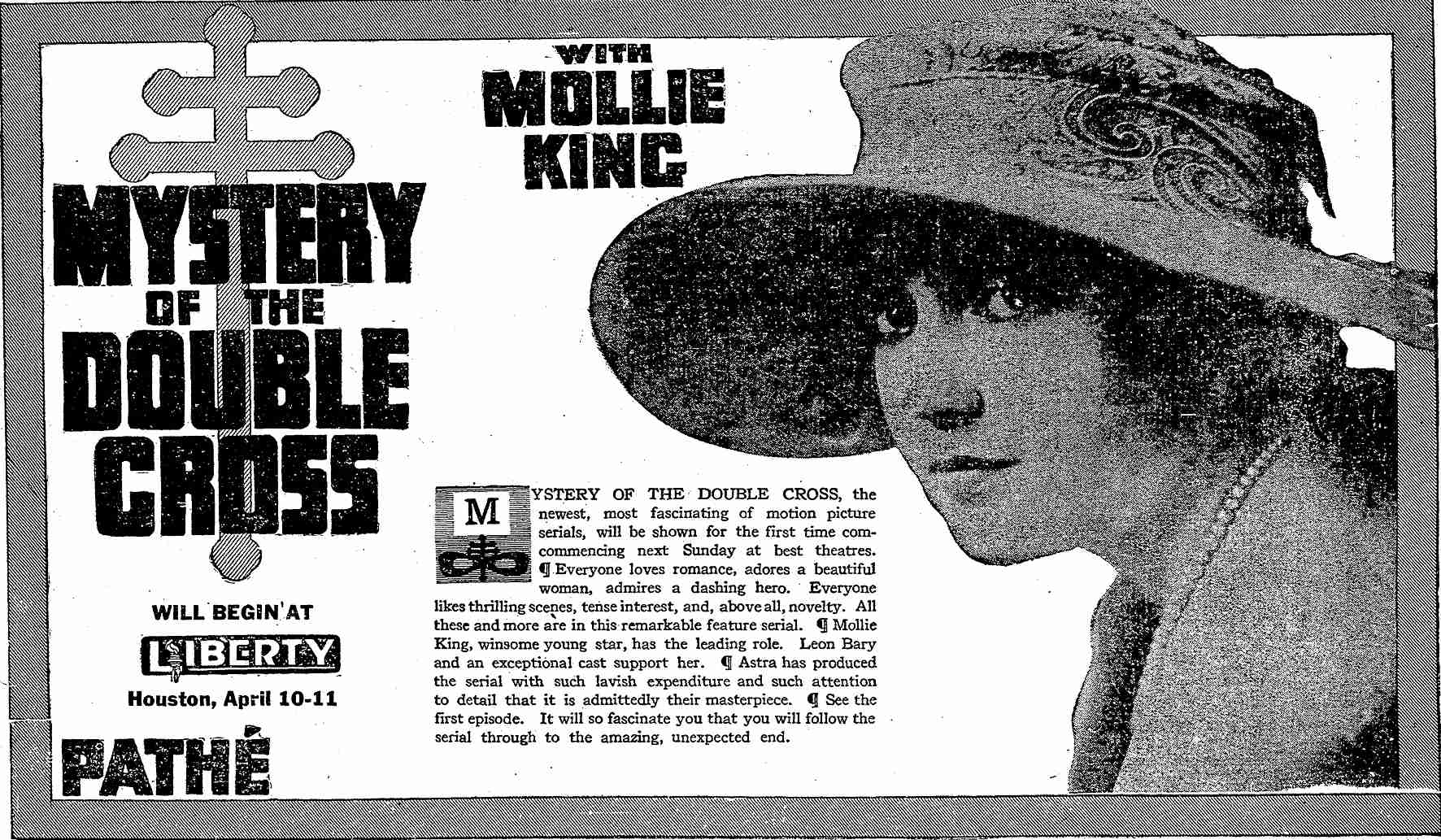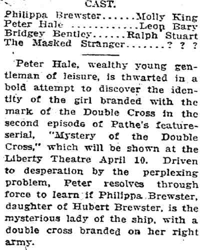 The Mystery of the Double Cross is a 1917 film and one of the few American silent action film serials to survive in complete form. It was directed by Louis J. Gasnier and William Parke, from a story written by Gilson Willets, produced by the Astra Film Corporation and released in weekly chapters by Pathé, starting March 18, 1917. Starring Molly King, this 15-part, action-adventure serial was also released in France and Portugal. Chapter 1 can be seen here. Prints exist in the Library of Congress film archive (AFI/Blackhawk Films collection), and various incompete sets and individual episodes have been marketed on-line. |