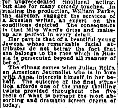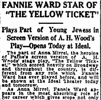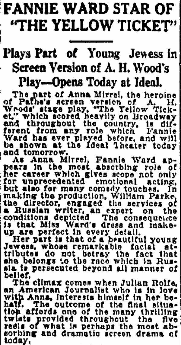 The last film William Parke made that was released by Astra, The Yellow Ticket was the movie version of A,H, Wood's play, which ran for six months on Broadway beginning in January of 1914. Oddly enough, in 1918, another version was being filmed in Germany, starring Pola Negri, This version was released in the United States in 1922 and is still in print. Parke had a strong cast, including the notorious Fannie Ward, Warner Oland, and Milton Sills, a now forgotten leading man who starred in film versions of Adam's Rib, The Sea Wolf, and The Sea Hawk. His career was cut short at the dawn if the sound era when he died of a heart attack on September 15, 1930. |