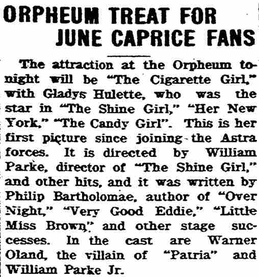 The Cigarette Girl paired Gladys Hulette with William Parke Jr., and also starred Warner Oland, the Swedish actor who went on to great fame as the original Charlie Chan in sixteen movies. . |