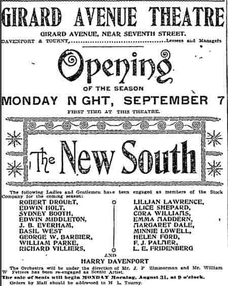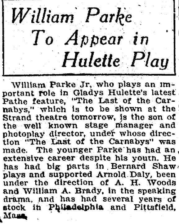 WILLIAM PARKE had a career in show business that spanned at least six decades. He was born in Bethlehem, Pennsylvania on June 18, 1873 to Anthony Parke and his wife, the former Mary Hallman. Prior to 1895 no records regarding him have been found, but he does appear in that year's Camden City Directory at 1112 Locust Street, and his occupation was listed as actor. From 1895 through 1898 he was a member of George Holland's stock company, which put on plays at the Girard Avenue Theater in Philadelphia. In time he became the assistant stage manager for the Holland Stock Company. William Parke married Julia Peacock, the daughter of Camden restaurant owner George Washington Peacock on June 27, 1896 at Bethany Methodist Church in Camden. Julia Peacock bore two sons, William Parke Jr. in 1897 and George Washington Parke in 1898. The family is listed at 316 Clinton Street in 1897 and 45 Cooper Street in 1898. In 1899 William Parke went to New York City, where he staged a revival of The Sporting Duchess and took the production on tour. Parke's production played in Baltimore, Philadelphia and Wilkes-Barre, Pennsylvania in October of 1899, in Dallas in November and in Evansville, Indiana in December, and possibly also appeared in Salt Lake City and other western cities. The 1900 Census shows the Parke family at 231 North Front Street. Around this time William Parke began to work even further away from Camden. In the March of that year he went to Denver, Colorado with a newly organized theater troupe known as The Western Amusement Company. William Parke did double duty in the show as an actor and as assistant stage manager to Harry Saint Maur, well known as an actor, playwright, and author, and remained in Denver until at least September of 1900. William Parke would go on to directing and producing plays and in time movies, with occasional roles as an actor on stage, film, and on Broadway. In 1900 Parke joined Shakespearean actor E.H. Sothern's company as advance stage manager for a road tour of Hamlet. For several years, Sothern dreamed of mounting a spectacular and precise production of Hamlet. He finally opened the play in New York in 1900, but during the first week, he was stabbed in the foot by Laertes' sword and was stricken with blood poisoning, closing the production. After he recovered, he revived the piece on tour, but the sets and costumes were destroyed by a fire in Cincinnati, Ohio. 1n 1901, he played the title role in Richard Lovelace and then François Villon in If I Were King . It was in this production where William Parke made his debut on Broadway. He also had a role in The Proud Prince at the Lyceum Theatre, New York City. He later worked with E.H. Sothern on a road production of The Proud Prince. The 1901 City Directory shows the William Parke family at 214 Ambler Street. The family never did live very far from Julia Parke's parents, whose home and business was at 60 Delaware Avenue. The Parkes are listed at 215 Stevens Street in 1902 and 1903. By the time the 1904 Directory was compiled, they had moved to 306 Cole Street. By 1902 William Parke was no longer the assistant, he was the stage manager for large productions in major cities. In 1903 he was again working for E.H. Sothern on The Proud Prince , which required casting 100 extras for a mob scene on stage. The show played in Baltimore in late November, 1903. In 1904 William Parke became a member of The Players, a social club founded by the great stage actor Edwin Booth, considered by many to be America's greatest 19th Century actor, whose achievements unfortunately are over shadowed by the single deed of his brother, John Wilkes Booth, who assassinated President Abraham Lincoln in 1865. William Parke remained an active member of the club until his passing in 1941. Subsequently William Parke was hired as stage manager Richard Mansfield's company, and appeared as an actor in productions of Beau Brummell and The Strange Case of Dr. Jekyll and Mr. Hyde, a role that Mansfield had originated. He was stage manager for Mansfield's production of Henrik Ibsen's Peer Gynt, which was the first U.S. production of this play. It opened at the Chicago Grand Opera House on October 24, 1906, and toured the entire nation. Richard Mansfield's popularity as a Shakespearean actor was immense. At the time of his death, The New York Times stated: "As an interpreter of Shakespeare, he had no living equal in his later days, as witnessed by the princely grace, the tragic force of his Richard, his thrilling acting in the tent scene of "Caesar", the soldierly dignity and eloquence of his Prince Hal, and the pathos of the prayer in that play. He was the greatest actor of his hour, and one of the greatest of all times." Mansfield died in New London, Connecticut, on August 30, 1907 at age 50, from liver cancer. 1906 is the last year William Parke is listed in Camden City Directories. It can be assumed that being away from home for months at a time did the marriage no good, and, as Julia Parke, beginning in 1908 referred to herself as a widow in city directories and census enumerations, that the divorce was acrimonious. During the 1910s William Parke Jr. joined his father and began a career as an actor, while younger son George W. Parke remained in Camden for pretty much the rest of his life. After Mansfield's company had disbanded, William Parke joined Arnold Daly, who had founded "The Theatre of Ideas" at the Berkley Lyceum which presented three one-act plays each night. He worked with Daly in the capacity of stage manager and also as an actor in several one-act plays. Daly disbanded his troupe late in 1907. In 1908 William Parke began working as the stage manager for the stock company of John Craig and Mary Young at the Castle Square Theater in Boston. On November 16, 1908 he married actress Alice Harrington, a Massachusetts native, who bore him a son, Richard Harrington Parke, on March 21,1909. The 1910 Census, taken April 26, shows William, Alice and Ri