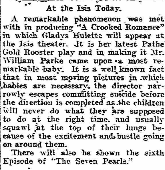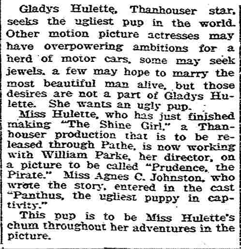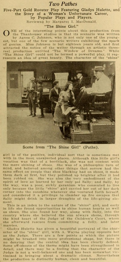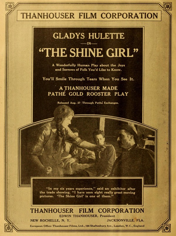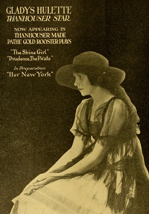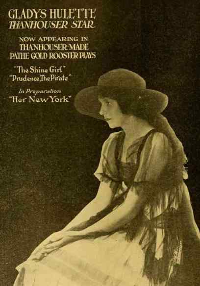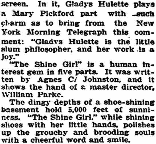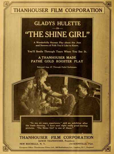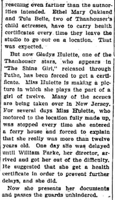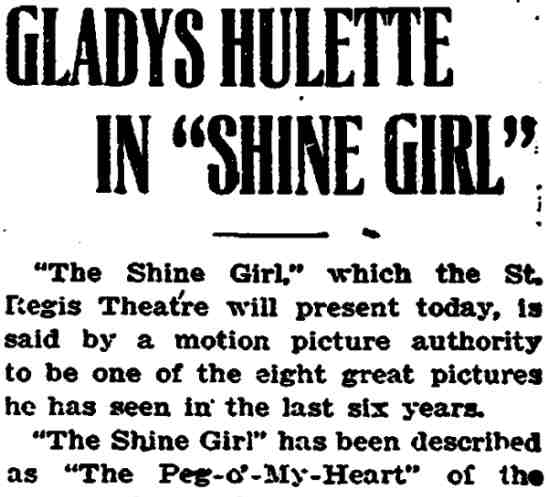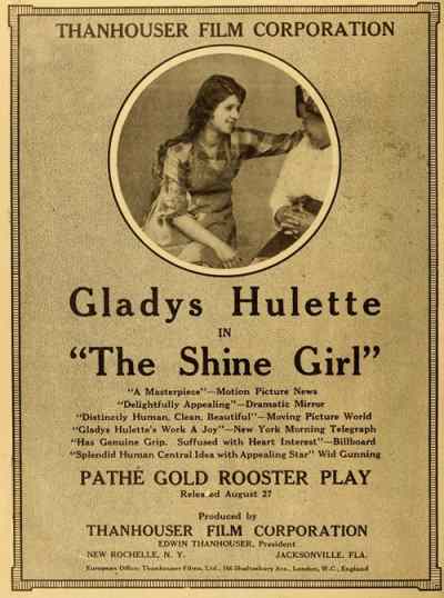 "The Park Theatre in Boston, managed by Thomas D. Sorerio, had one of the biggest days in its history on Monday, September 25. Gladys Hulette, the Thanhouser star, appeared in person at three showings of her Pathé Gold Rooster play, The Shine Girl all week. Such a drawing card was Miss Hulette that the Park played to capacity all day and crowds were waiting to get in even for the 6 o'clock performance. When Miss Hulette arrived at the theatre for her afternoon appearance, after she was snapped by the newspaper photographers and the Pathé Weekly [newsreel] man, she was taken to her dressing room over the entrance to the theatre. Ten minutes later, when she tried to leave the room, the key jammed in the lock and she was unable to get out. (At least so said the Thanhouser press agent.) She had to appear on the stage at 3 o'clock. An extension ladder was run up to the window from which Miss Hulette was calling for aid. By this time the street was crowded with people from curb to curb. Miss Hulette obviously couldn't climb down three stories, above the heads of such a crowd in the gown she was going to wear on the stage. Somebody solved the problem by finding a pair of overalls. Miss Hulette donned the overalls, scrambled down the ladder and ran into the theatre, on time for her performance. In the evening Mr. Sorerio gave a banquet for Miss Hulette." |