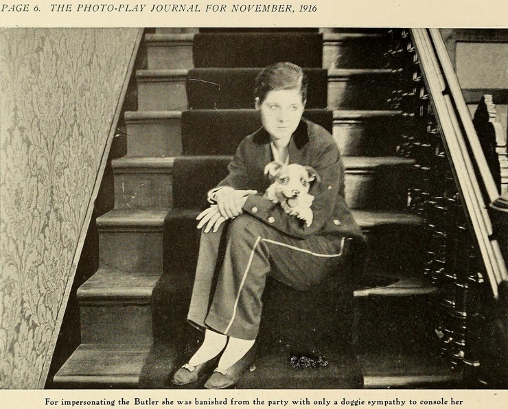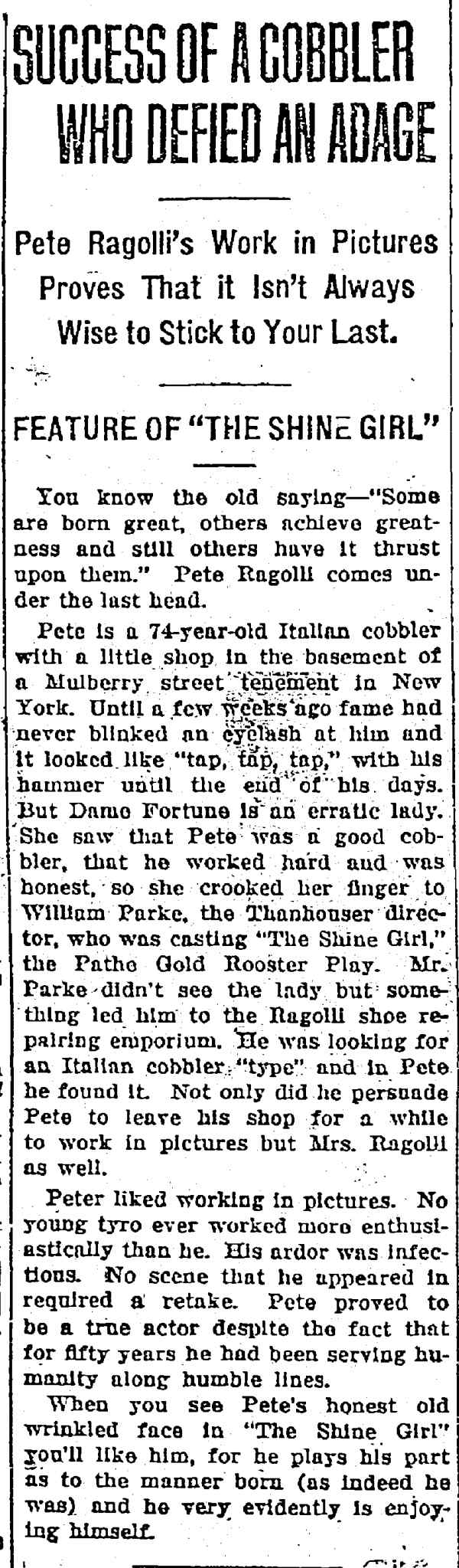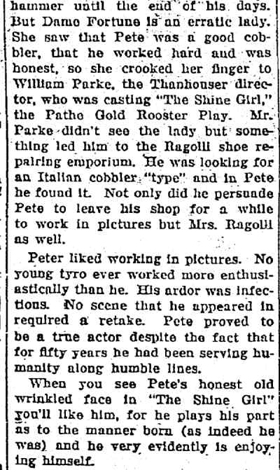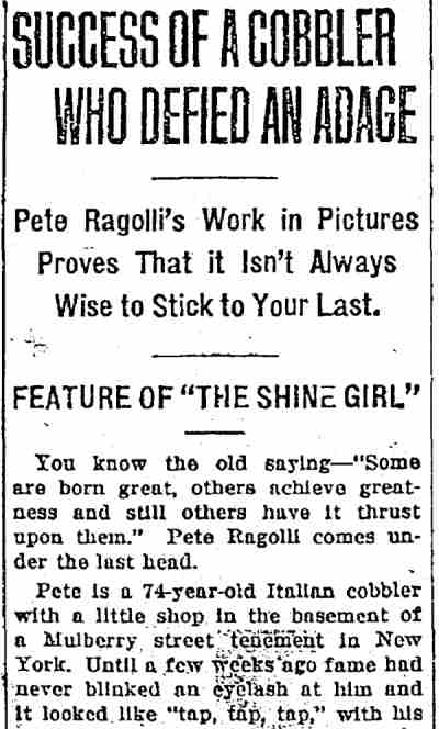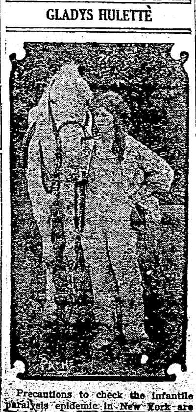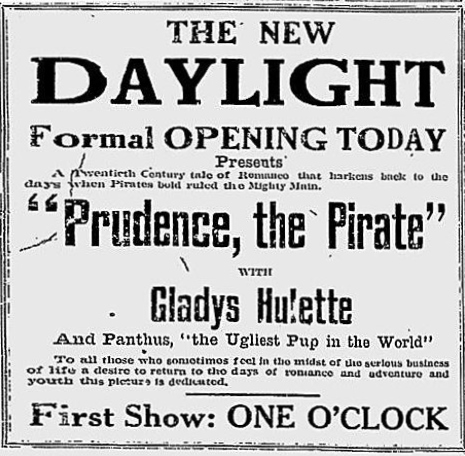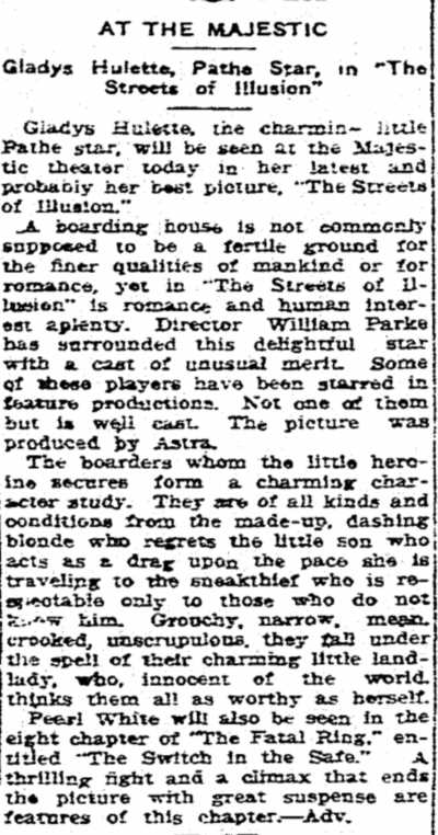 "The Park Theatre in Boston, managed by Thomas D. Sorerio, had one of the biggest days in its history on Monday, September 25. Gladys Hulette, the Thanhouser star, appeared in person at three showings of her Pathé Gold Rooster play, The Shine Girl all week. Such a drawing card was Miss Hulette that the Park played to capacity all day and crowds were waiting to get in even for the 6 o'clock performance. When Miss Hulette arrived at the theatre for her afternoon appearance, after she was snapped by the newspaper photographers and the Pathé Weekly [newsreel] man, she was taken to her dressing room over the entrance to the theatre. Ten minutes later, when she tried to leave the room, the key jammed in the lock and she was unable to get out. (At least so said the Thanhouser press agent.) She had to appear on the stage at 3 o'clock. An extension ladder was run up to the window from which Miss Hulette was calling for aid. By this time the street was crowded with people from curb to curb. Miss Hulette obviously couldn't climb down three stories, above the heads of such a crowd in the gown she was going to wear on the stage. Somebody solved the problem by finding a pair of overalls. Miss Hulette donned the overalls, scrambled down the ladder and ran into the theatre, on time for her performance. In the evening Mr. Sorerio gave a banquet for Miss Hulette." |