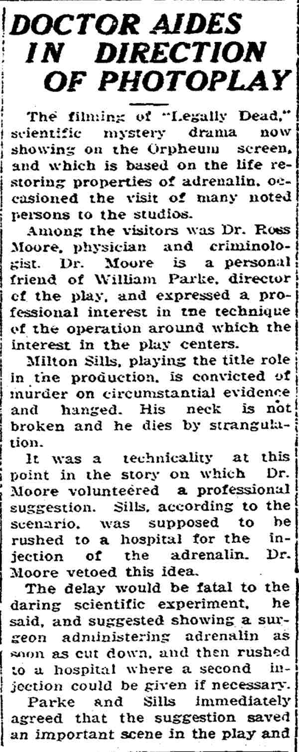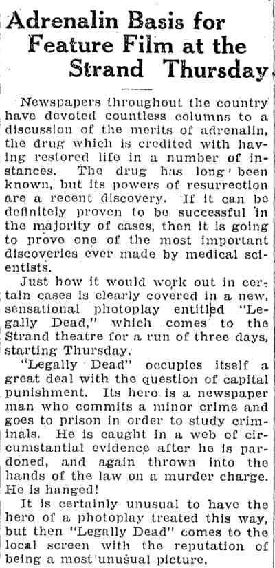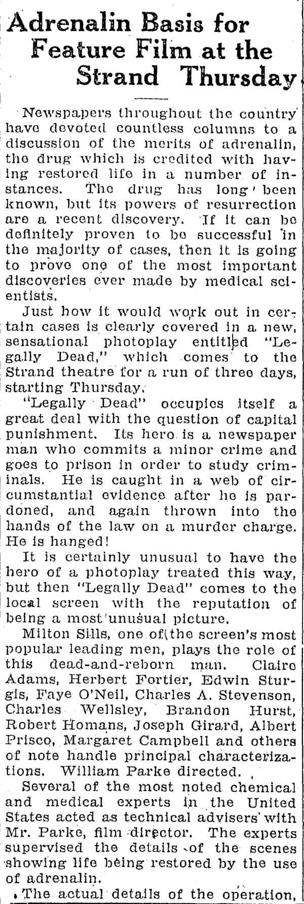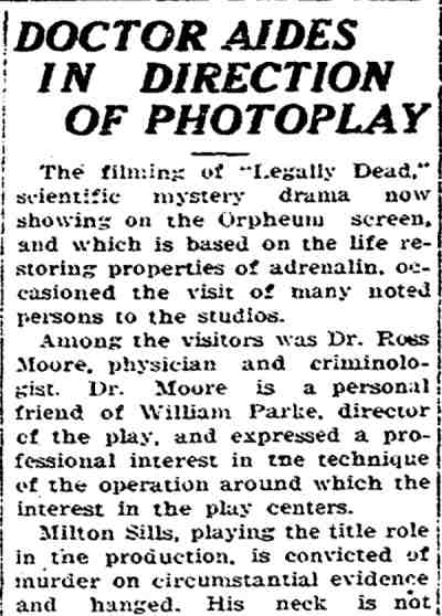 William Parke made three pictures for Carl Laemmle's Universal Studios in 1923. Universal reached film immortality several years later in the horror genre with Dracula, frankenstein, and The Mummy, but the film Legally Dead proves that Laemmle had an eye for what could be call unconventional subjects in film. Milton Sills and Claire Adams, who had starred in Key To Power also appear in this film. |