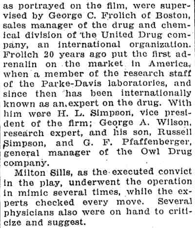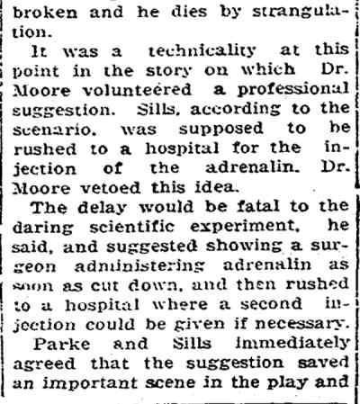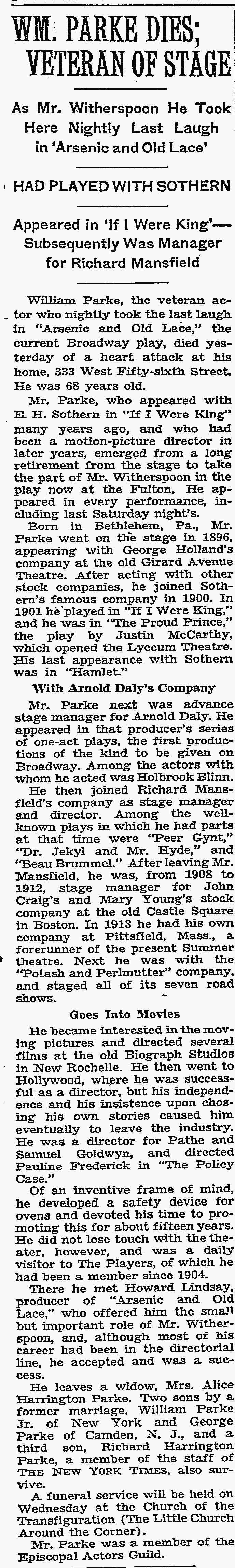William Parke's final bow in show business was as Mr. Witherspoon in the original cast version of Arsenic and Old Lace massive hit that ran for three and one-half years on Broadway where it was performed 1,444 times. This was also the third "Universal Coincidence" as Boris Karloff, the monster in Frankenstein AND Imhotep in The Mummy, was a member of the cast, as was a young Bruce Gordon, who played Frank Nitti in the television show, The Untouchables. Other members of the original cast also worked in movies and television as well. His last performance was on Saturday, July 27, 1941. William Parke died of a heart attack at his apartment the next day. |