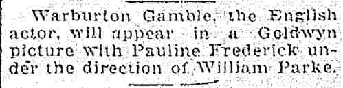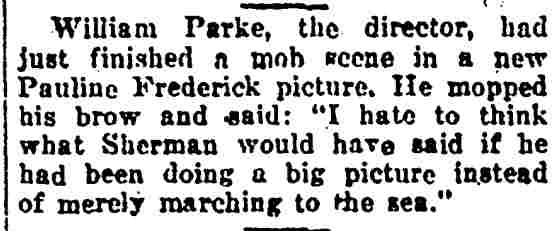 In 1919 William Parke went to Hollywood, where he made a film with one of the biggest stars of the day, Pauline Frederick. Sadly of her sixty-seven films, only fifteen survive (8 silents and 7 talkies). Unfortunately, this is one of the lost films, but you can see still photos and read reviews here, or better yet, time permitting, read the book by Edgar Saltus. |