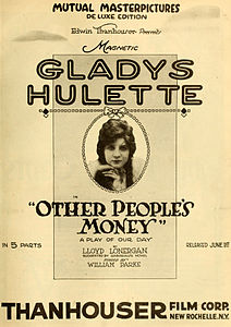 "Exposé of a band of notorious get-rich-quick schemers and their nefarious methods pursued in obtaining the confidences and frequently the savings of a gullible public has been made the basis for a stirring photodrama to be released shortly by the Mutual Film Corporation. In the preparation of the scenario the Thanhouser-Mutual studios were furnished with considerable data by federal agents and by several noted government sleuths who have been instrumental in breaking up a number of bands of notorious get-rich-quick plotters. This stirring production will be released through the Mutual as a Masterpicture, DeLuxe Edition, under the title of Other People's Money. The five acts of the piece are alive with action and replete with thrilling situations. Throughout runs an unusually pleasing love story, ending with the happy marriage of the young girl who brings about the exposé of the band and the young detective, with whom she worked. Gladys Hulette, the five-foot star of the Thanhouser-Mutual productions, is the featured player, supported by an extraordinary company of players, headed by Fraunie Fraunholz, a newcomer, but by no means an unknown player. Other People's Money will be released in five acts, May 29." |