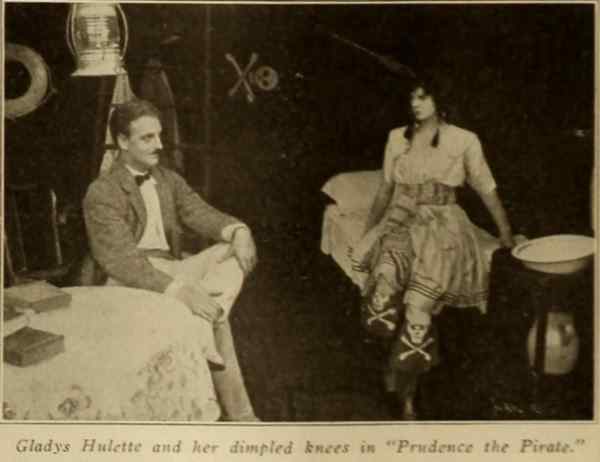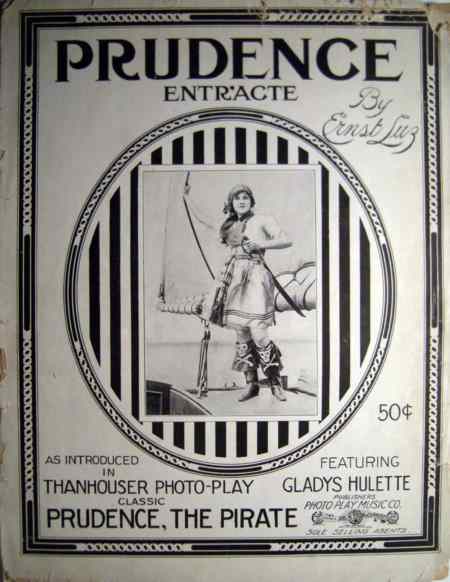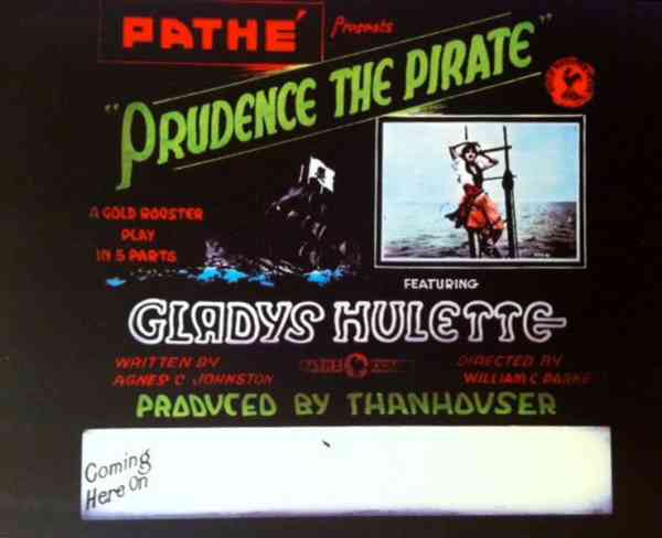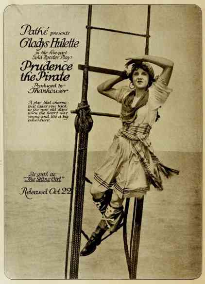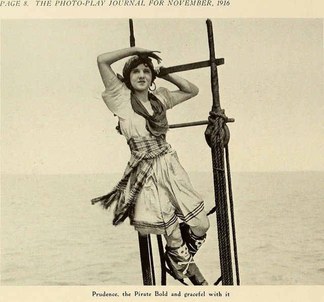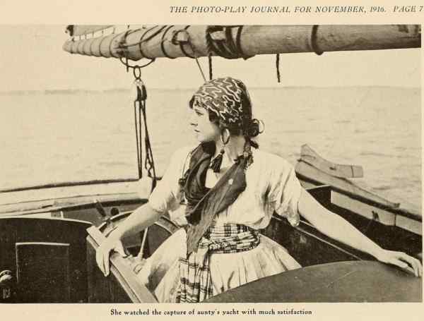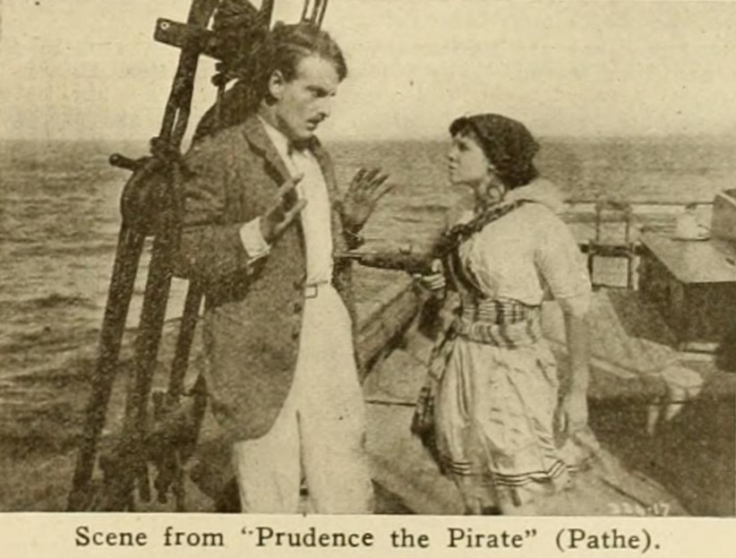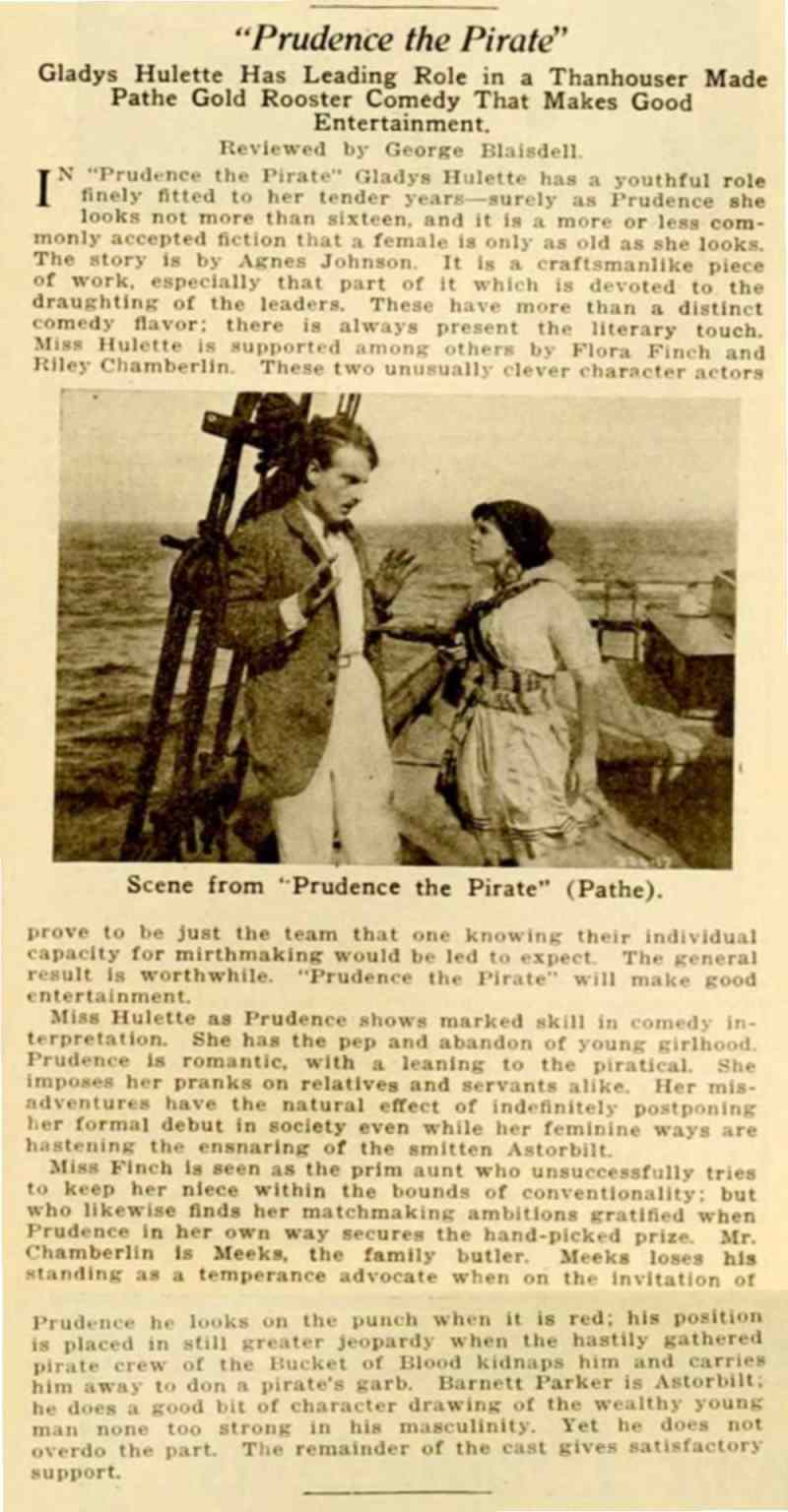 ""As a whole: entertaining; story: conventional; star: lacks vivacity; cast: adequate; settings: good; photography: clear. "In this Thanhouser photoplay we are given some fine touches of comedy, good direction and excellent screen acting. Flora Finch is cast in the role of Aunty, while Riley Chamberlin contributes a goodly portion of the fun as Meeks. Miss Hulette, beautiful and pleasing as ever, did not seem to get all the comedy out of the part assigned to her. The supporting cast is well chosen. Prudence should prove to be a good attraction and is well up to the Thanhouser standard. Prudence, just out of boarding school, returns to her aunt's home where she is to enter society. She objects decidedly, and after several escapades, particularly directed against one Astorbilt, the season's 'catch,' she finds a warm friend finally in the person of the family butler. Meeks confides to Prudence that he has been a sailor and 'seen things.' When pressed further concerning his seafaring life he confides that he was once a pirate. He tells of his adventures and Prudence, her romantic nature fired, decides to becomes a buccaneer. A schooner is rented and christened The Bucket of Blood, a motley crew of tramps are put aboard, and all is in readiness for a voyage except a chaperon and a deck scrubber. Prudence attacks her aunt's houseboat and kidnaps the old lady and Astorbilt to fill those capacities. Astorbilt, however, bribes the crew to mutiny, and Prudence finds herself in irons on her own ship. The rough and tumble life aboard The Bucket of Blood changes Astorbilt from a pink tea person to a man of steel and Prudence falls in love with him. Fire breaks out on the ship and Astorbilt swims with Prudence to a bell buoy and saves her life. There Prudence, with her customary disregard for convention, promises to lower the black flag and surrender her heart forever. It is a clever comedy, indeed." |