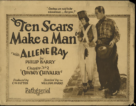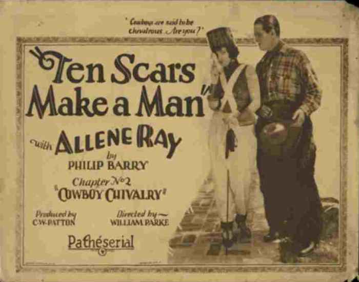 An action serial in ten-parts starring the great Allene Ray, who did ALL of her own stunts, and Jack Mower, who in mostly un-credited roles appeared 607 different movies between 1914 and 1963, and produced several films in the 1920s. Ten Scars Make A Man was also released in Brazil as Dez Cicatrizes Fazem um Homem, with Portuguese title cards. |