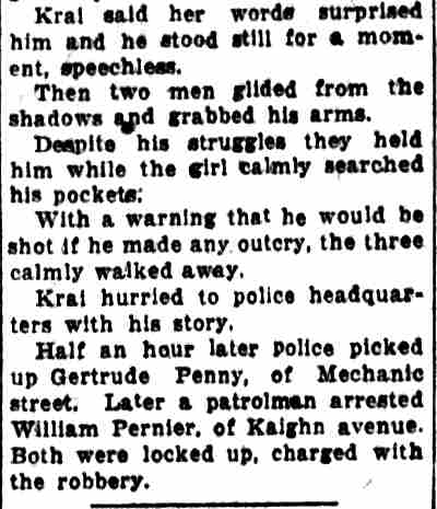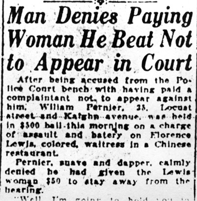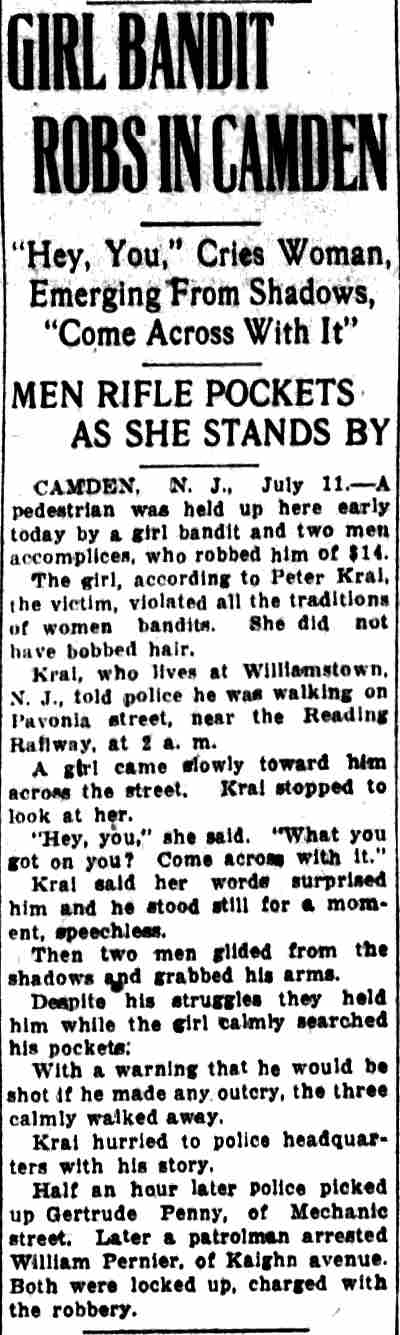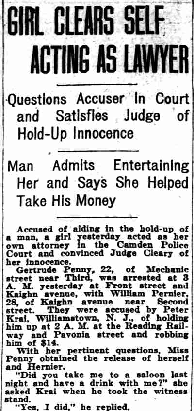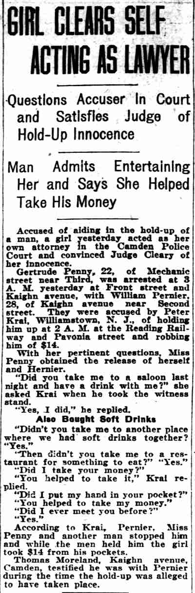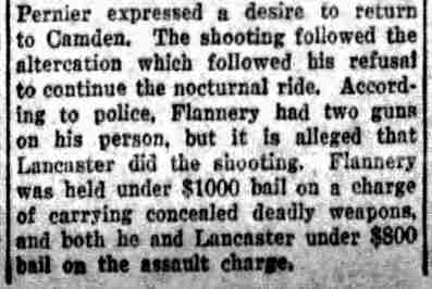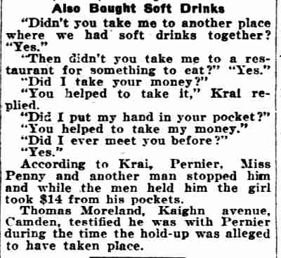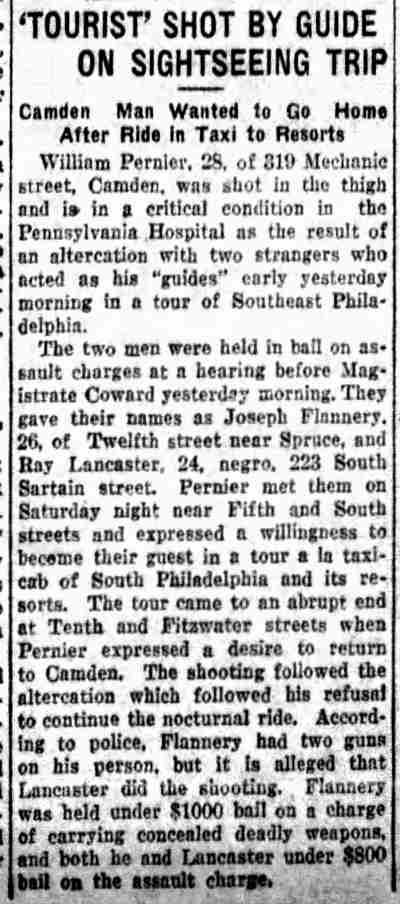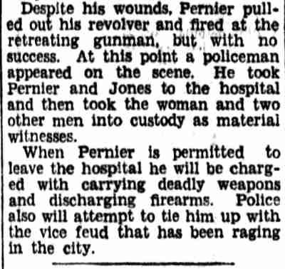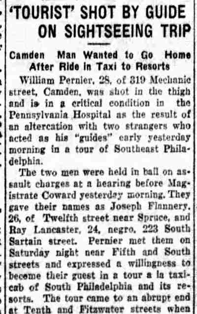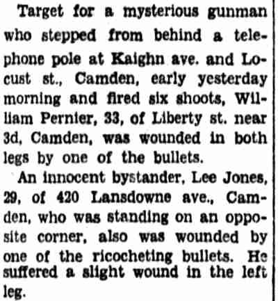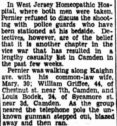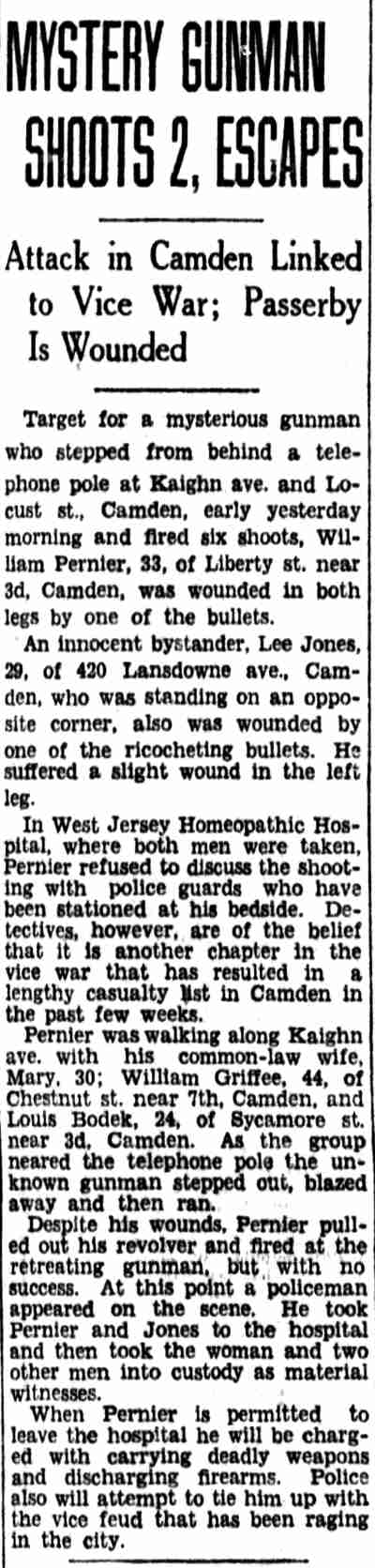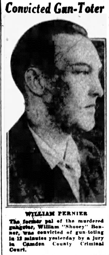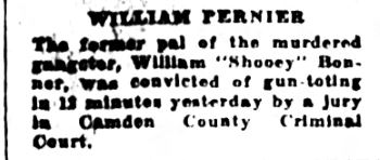 YEAR SENTENCE IS GIVEN PERNIER Despite his plea that he was still suffering from a gunshot wound received October 30, William Pernier, 32, of 293 Liberty street, was sentenced to serve from two to three years in the state prison for carrying deadly weapons. Pernier's wife, Edith, screamed and was led from the courtroom when the sentence was pronounced by Judge Samuel M. Shay. Pernier, former pal of the slain William "Shooey" Bonner, was arrested by three policemen who found him lying wounded and holding a revolver which they said was "still hot" at Locust Street and Kaighn Avenue. When tried in Criminal Court, Pernier's defense was that he had been wounded by gunmen and that he had picked up the revolver dropped by a one of his assailants. A jury deliberated only 12 minutes before returning a verdict of guilty after a short trial on January 24. Request for postponement of sentence was made at that time by Julius Sklar, Pernier's attorney. Judge Shay remanded Pernier to jail to await sentence after setting yesterday as the date when he should learn his fate. |
