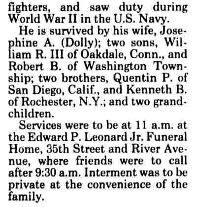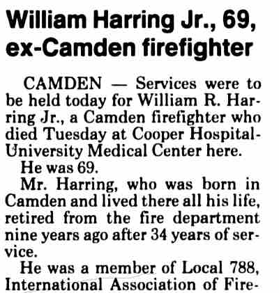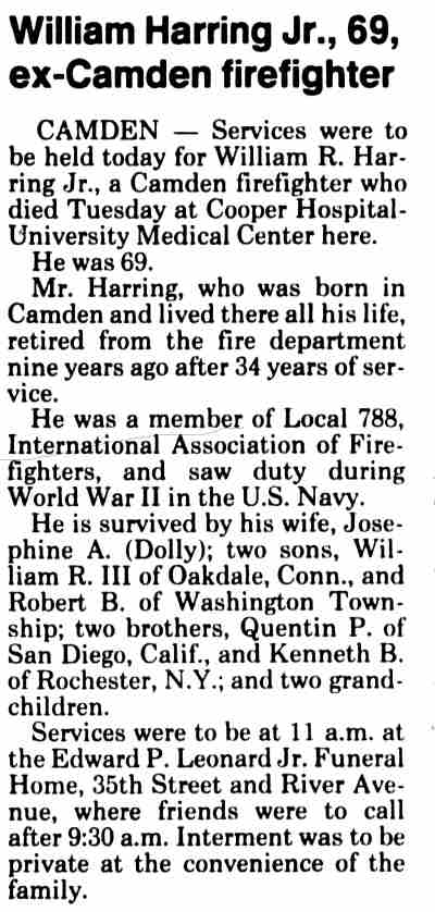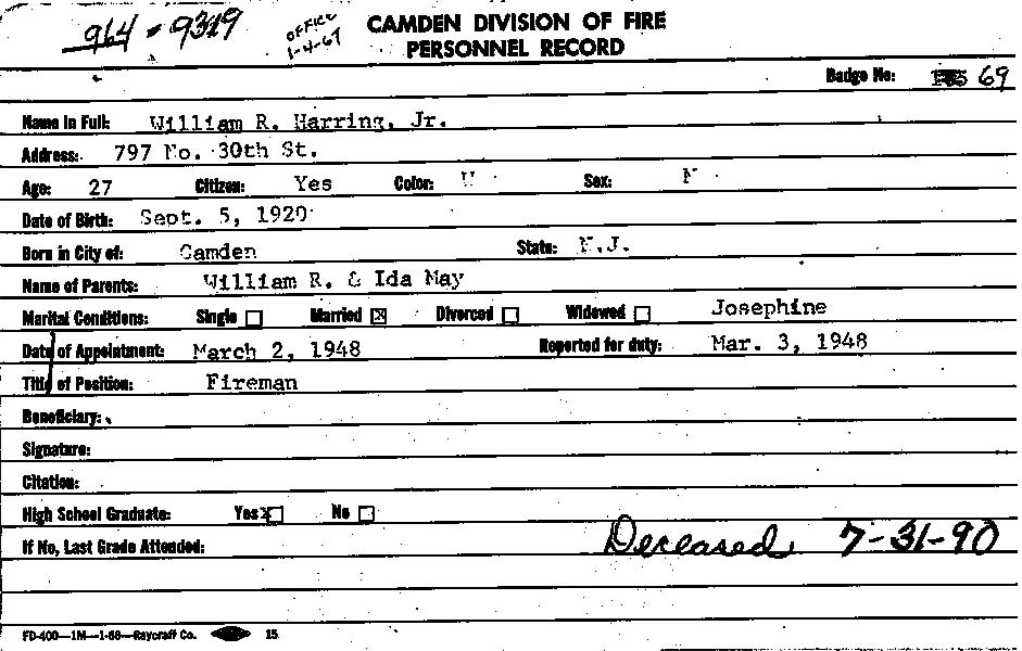 WILLIAM R. HARRING JR. entered this world on September 5, 1920, the second child born to Ida May and William R. Harring in in Camden, New Jersey. His father, who had a long and distinguished career with the Camden Fire Department, had joined the department at some point between June 5, 1917 and the date of the 1920 Census enumeration. Great-uncle Samuel E. Harring also served with the Fire Department, from the 1900s into the early 1930s. In January of 1920 the Harrings and older son Quentin lived in North Camden at 130 Main Street, the home of Ida May's parents, Walter and Alice Banks. By 1924 the Harrings had moved to 812 North Front Street, a stones throw from their previous residence. Sadly, it appears that Ida May Harring had passed away by 1926. William Harring Sr remarried in 1926, second wife Marie Wade was 18 at the time. The Harrings continued to reside at 812 North Front Street through at least the spring of 1942. William Harring Sr. reached the rank of Deputy Chief by the time his career ended. William Harring Jr. was appointed to the Camden Fire Department on March 2, 1948. He reported for duty the following day. By 1956 William R. Harring Jr. and his wife, the former Josephine Simpson, were living in cramer hill at 797 North 30th Street. He retired from the Camden Fire Department on July 1, 1981. A lifelong Camden resident, William Harring Jr. passed away on July 31, 1990. He was survived by his wife and sons William R. Harring III and Robert Harring. The Harring family was still at 797 North 30th Street as late as 2002. Josephine Harring joined her husband in November of 2005. |
