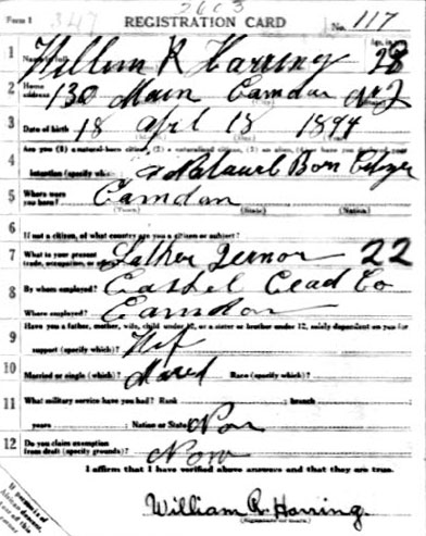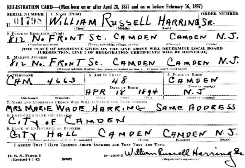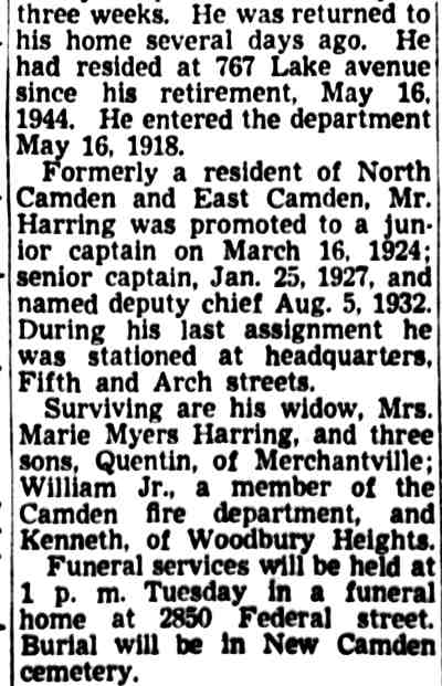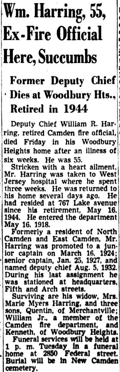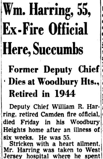 WILLIAM RUSSELL HARRING SR. was born in Camden on April 18, 1894, apparently to Walter H. and Lottie Harring. The 1895-1896 City Directory shows the family at 605 North Front Street. Walter Harring's brother Samuel E. Harring and his wife Josephine lived on the same block, at 619 North Front Street. When the Census was taken in 1900, he was living with his grandparents, Samuel and Rosa Harring, in Philadelphia. Walter Harring also living there, it is unclear at this time what had become of Lottie Harring, but it is probable that she passed shortly before or after the 1900 census was taken. By the time he turned 16, William Harring had returned to Camden. William Harring's uncle, Samuel E. Harring, was a bricklayer by trade, but at some point during the 1900s had traded in his mason's trowel to become Camden fire fighter. When the Census was taken William Harring was living with his Uncle Samuel at 125 Linden Street in North Camden, a short walk from the Engine Company 6 firehouse. Samuel E. Harring's career as a Camden fire fighter lasted into the 1930s. When William Harring Sr. registered for the draft in June of 1917, he had already married Ida May Banks. The couple lived in North Camden at 130 Main Street, the home of Ida May's parents, Walter and Alice Banks. A son, Quentin was born in 1918, and William Jr. joined the family in 1920. William Haring was appointed to the Camden Fire Department on May 16, 1918. He was promoted to Junior Captain on March 16, 1924. By 1924 the Harrings had moved to 812 North Front Street, a stone's throw from their previous residence. Sadly, Ida May Harring died of tuberculosis on April 2, 1925. William Harring Sr. remarried in 1926. His second wife Marie Wade was 18 at the time. William Harring Sr. was promoted on April 4, 1928 to Senior Captain of Ladder Company 1, based at Fire Headquarters, North 5th Street and Arch Street. He further advanced to the rank of Deputy Chief on August 5, 1932 Son Quentin Harring was active in Boy Scouts in the early 1930s. The Harring family continued to reside at 812 North Front Street through at least the spring of 1942. William Harring Sr. reached the rank of Deputy Chief by the time his career ended on May 16, 1944. He died of a heart ailment on November 25, 1949 at the age of 55 at his home in Woodbury Heights, New Jersey. Son William Harring Jr. was appointed to the Camden Fire Department on March 2, 1948, and served for over 23 years. He retired from the Camden Fire Department on July 1, 1981. |