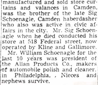 WILLIAM SCHOENAGLE was born in Germany around 1880. He came to America in 1890. He owned and operated a factory in Camden NJ that manufactured store curtains and valances through at least 1930. By that time he had moved to 5817 Pine Street in Philadelphia PA to live with his sister-in-law and her family. William Schoenagle became the president of the Allen Products Company, a manufacturer of automobile polishes and cleaners around 1940. William Schoenagle was the younger brother of Sigmund "Sig" Schoenagle, who for many years operated a haberdashery at 518 Federal Street in Camden, and who was active in the civic affairs of Camden. In the early 20s William Schoenagle his brother were active participants in the Community Hotel fund raising drive that culminated in the erection of the Walt Whitman Hotel. He placed the advertisement below in the Camden Courier-Post special edition commemorating the opening of the Delaware River Bridge. William Schoenagle passed away on January 13, 1950 in Philadelphia. |