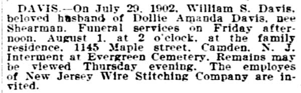 William S. Davis was born in Pennsylvania in August of 1847. According to the 1890 Veterans Census, he served in the United States Navy aboard the USS Powhatan in 1862. Two other members of the crew during that time, Barton Lane and William Marsh, also became Camden Fire Department members in later years. He married Dollie Amanda Shearman around 1870. His wife was the daughter of William H. Shearman, who was an original member of the Camden Fire Department, serving in the rank of Assistant Chief Fire Marshal for the first fire district. City Directories and Fire Department records show William Davis living at 525 Federal Street in September of 1872. By April of 1874 he had moved to 425 Federal Street. The Davis family was living at 535 Arch Street in April of 1877, They moved to 28 North 5th Street the following year, remaining at that address as late as 1885. The 1880 Census shows him, his wife Amanda, and children Mary, William, and Mabel. The 1900 Census states that William S. Davis and his wife Amanda had four children of which three were still alive. The 1888-1889 Directory states that he lived at 428 South 2nd Street, and was working in Philadelphia. By 1890 he had moved to 516 North 9th Street. The 1891-1892 and 1892-1893 Directories give his address as 822 Carpenter Street. He is not listed in the 1893-1894 and 1894-1895 editions. By the time the 1896 Directory was compiled he had moved to 335 North 9th Street, where he stayed through 1898. By 1899 William S. Davis had relocated to 1129 Maple Avenue. William, Amanda, and daughter Mabel Davis were still at 1129 Maple Street when the 1900 Census was conducted. They moved to 1145 Maple Street shortly afterwards. William S. Davis passed away on July 29, 1902. He had been working for the New Jersey Wire Stitching Company prior to his passing. His widow was living at 840 Pearl Street when the 1906 City Directory was compiled, and by 1910 had moved to 430 Washington Street, where daughter Mary Davis Riddle kept a saloon. A veteran of the United States Navy during the Civil War, William S. Davis was a member of Thomas M.K. Lee Post No. 5 of the G.A.R. |