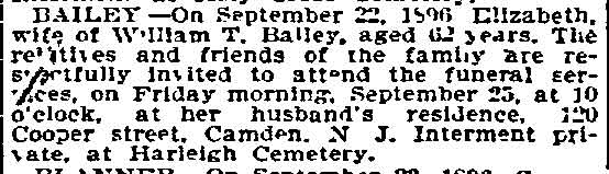WILLIAM T. BAILEY was born in Gloucester County NJ in 1836 to William Bailey and Lynda Denstan Bailey. He married Elizabeth McFarland on November 17, 1859 at the Methodist Episcopal Parsonage in Clarksboro NJ, a few miles south of Woodbury. The Baileys had at least three children,John Leonard Bailey born about 1859, William T. Bailey Jr., born about 1865, and Emmarilla Bailey born about 1869. By the time the 1870 Census was taken William T. Bailey was living in Camden NJ with his wife and three children. He was then working as a fire and life insurance agent. He would engage in a variety of business pursuits over the next four decades, and was among the leading businessmen in the city. The 1880 Census shows William T. Bailey owning a home at 203 State Street in north camden. his next door neighbor at 301 State was Augustus Reeve, the oilcloth manufacturer, and Richard Esterbrook, of the Esterbrook Pen Manufacturing Company, lived at 303 State. Other prominent neighbors were John J. Burleigh at 326 State, William Bleakly at 316 State, and Joseph Troth at 220 State Street. William T. Bailey remained a resident of 203 State Street through the 1880s into the 1890s. By 1896 he had moved to 120 Cooper Street. William T. Bailey appears in the Camden City Directories in the years 1887 through 1891 in connection with several business. Working out of offices at 106 Market Street, he was a partner with A. B. Nelson in the firm of Bailey & Nelson, engaging in railroad and bridge construction. He was secretary of the Barnegat City Beach Association, with Benjamin F. Archer and Enoch Boice being the other officers; and with Boice and Charles T. Parry he was treasurer of the Staffordville Gravel Company. William T. Bailey also had his own contracting business. Taking part in the great wave of house building that took place in Camden in the late 1870s and 1880s, William T. Bailey in 1888 built and sold rows of homes between North 5th and North 6th Streets, on state, Bailey, grant, and York Streets. It is highly likely that Bailey Street in North Camden was named by and/or for him. The 1890-1891 City Directory shows that William T. Bailey and his partners had moved their offices to 301 Market Street, the then newly-opened New Jersey Trust building, better known as the Security Trust building. He also had joined Edward Ambler Armstrong and John J. Burleigh in a new enterprise, the Camden Lighting And Heating Company, with offices 40 North Front Street. Another Bailey business was the Camden Storage Warehouse Company, whose building was destroyed by fire in May of 1904. The Home for the Aged and Infirm of the Methodist Episcopal Church in the County of Camden, State of New Jersey, was incorporated February 3, 1890. It was formally opened April 15, 1890. It was furnished complete at 531 York street, Camden, N. J., with Auxiliaries from eight churches, as follows: Centenary, Tabernacle, Third Street, Broadway, wiley, Union, Haddonfield and Gloucester M. E. Churches. Mr. william t. bailey of Centenary M. E. Church, donated the rent, amounting to $20 per month, toward the fund for a permanent building. During the first year nine old ladies became members of the Home. Elizabeth Bailey passed away on September 25, 1896. William T. Bailey married Jessie Haberstrom on March 25, 1898. William T. Bailey passed away on October 31, 1908. |
