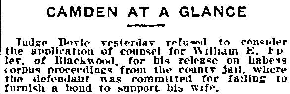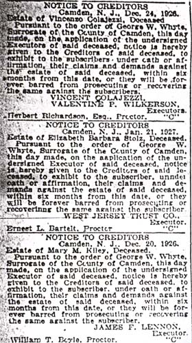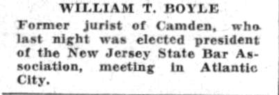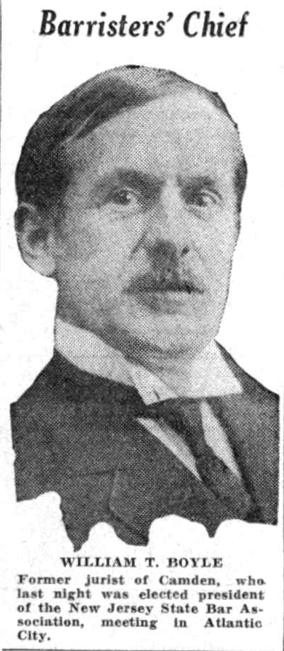 WILLIAM T. BOYLE practiced law in and around Camden from the 1890s through the late 1940s. He served as a judge from 1912 to 1917 and was president of the New Jersey Bar Association in 1932-1933. He was a director of the First Camden National Bank & Trust Company, and was active in Catholic church affairs and the Rotary organization. The Camden County Bar Association at one time had an award known as the William T. Boyle Award for Distinguished Community Service. One awardee was Camden business owner William J. Myles. William T. Boyle passed away after a long illness in September of 1951 and was buried in Calvary Cemetery in what was then Delaware Township (present-day Cherry Hill), New Jersey. His wife, Emma W. Boyle, had died the previous year. |