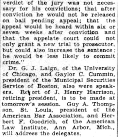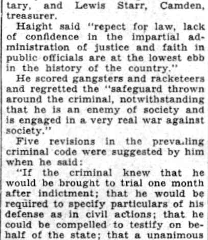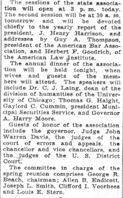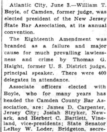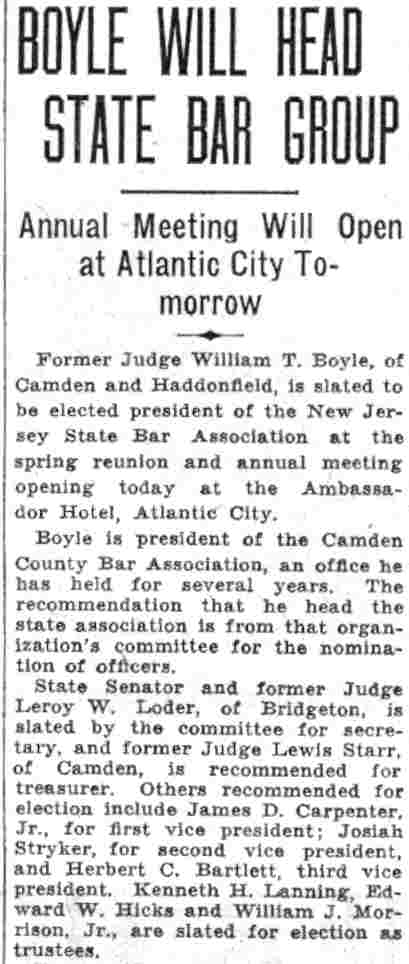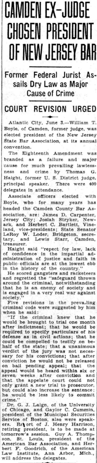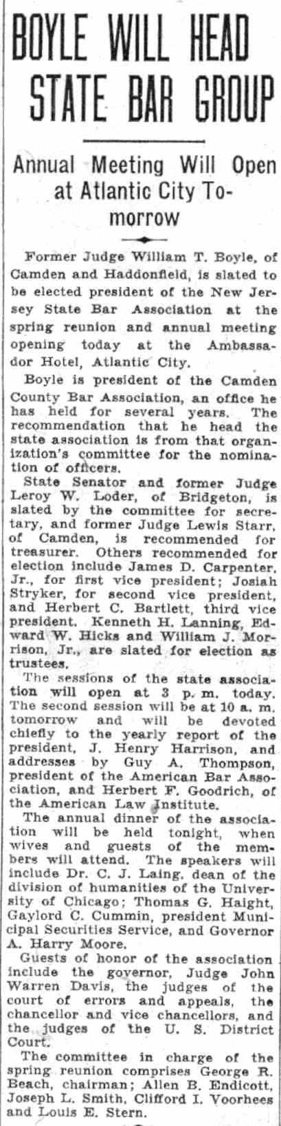 BOYLE HITS POLITICS IN NAMING JUDGES By Staff Correspondent Atlantic City, June 3.-The "abhorrent” practice of “parceling out judicial offices as part of a nefarious spoils system" must cease if the honor and eminence of the bench is to be upheld, former Judge William T. Boyle, of Camden, told the State Bar Association yesterday. Boyle, delivering his farewell address as retiring president of the association, mentioned no names. However, he apparently was referring to certain judicial appointments which recently drew widespread criticism, not because of the ability of the appointees but because of the political nature of the nominations. He spoke of one county which has a vacancy in the office of prosecutor and a vacancy on the common pleas bench, neither of which has been filled because the political leaders could not get together and decide who they wanted. "It seems," he observed, "that one senator is able to block appoint ments.” Senate President Richards, of Atlantic City, has been at odds with Democratic leaders In Atlantic County over appointments to the common pleas bench and the prosecutorship in that county. "'At one time," said Boyle, “there were standards for qualifications maintained for men of the bench. In recent years, however, appointing and confirming powers engage in what appears to be a battle of political strategy over judicial appointments. "The political party system permeates every branch of government in the state, but it should have no part where the administration of justice is concerned or is involved. "We cannot be unmindful of the criticisms of the press, reflecting upon the manner in which judicial selections have been made in recent years. The bar association is without influence in this branch of government which is most vital to this profession. "In the selection of judicial offi-cials such an organization should not be ignored. We have complacently submitted to the growth of a system that is bringing reproach to the administration of justice. "There is talk of trade and barter respecting these high offices throughout the state, and the press has not hesitated to express sharp criticism of political deals involving judicial offices. This association should not remain silent while political county committees appraise and endorse their favorites for office, with only the political import of the appointee in mind. Highest Types Needed “It would be a great day for the state only the interests of the people were considered where courts are concerned, I trust the day will Men, after years of honorable service upon the bench, have failed reappointment, because political leaders have been opposed to them. This parceling out judicial offices as a part of a nefarious spoils system is abhorrent and should be met with vigorous protests from this association. "The time is at hand for courage-ous and determined action on our part. Otherwise, the profession of the law will yield its position of eminence, honor and influence in the forum and on the bench to the place-hunter and spoils-monger, and then, if that day shall ever arrive, there will be missing from the temples of justice the learned and honorable ministers to whom we have been so long accustomed and the glory of the bar will pass forever." Fears that the sweeping moves of the Roosevelt administration since March 4 would raise grave legal questions was expressed by William D. Mitchell, of New York, solicitor general under President Coolidge and Attorney general under President Hoover "What has happened in Washington in the last three months," Mitchell said, "will keep lawyers occupied for the next three years. It is obvious that the courts are to be confronted with grave legal questions during a period of great unrest and public agitation." . |
