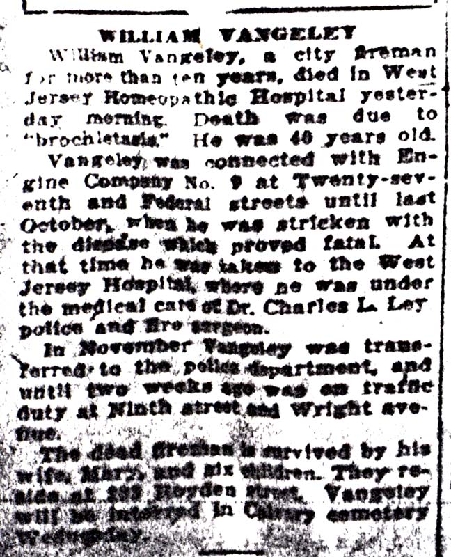 Vangeley was appointed to the Camden Fire Department in 1918. He was