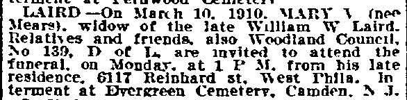 In the spring of 1884 William W. Laird was appointed to the Camden Fire Department to serve as stoker with Engine Company 1. Daniel A. Carter was then the Chief of the Department. When Samuel S. Elfreth was elected Chief in 1885, William Laird was kept on as stoker. In 1886 the Camden Steam Fire Engine Company Number 1 was located at 409 Pine Street in a three story 20 by 90 foot brick building (the old Independence Fire Company No. 3 engine house). The company's apparatus was an Amoskeag second class steamer (maker's plate 6318) drawn by two horses and one Silsby two wheel hose cart drawn by a single horse. The company was equipped with 1000 feet of good hose, axes, lamps, etc. The company roster included John Stockton, Foreman; G. Rudolph Tenner, Engineer; William Deno, driver; William W. Laird, stoker; Wilson Bromley and jacob f nesson, hosemen. call men were William Deith, andrew miller and William Bogia. Bromley and Bogia would later suffer line of duty deaths. The 1887-1888 City Directory shows William Laird, a laborer, at 611 South 7th Street. The 1888-1889 editions show William W. Laird living at 717 Blaine Street, an working as the fireman in the boiler room at Camden's City Hall. He was still living at 717 Blaine Street when the 1890-1891 edition was compiled. He was then working for the Pennsylvania railroad as a conductor. The 1893-1894 Directory shows him at 428 South 2nd Street, and the 1895-1896 edition states that he lived at 729 Clinton Street and was working as a car inspector for the Pennsylvania Railroad. It appears that William Laird moved to Philadelphia in the late 1890s. A daughter, Josephine Winifred Laird, was born in Philadelphia late in 1898. Sadly, she died of gastroenteritis on July 8, 1899. She was buried at Evergreen cemetery in Camden on July 11. William W. Laird passed away at some point prior to March of 1910. His widow Mary lived in Philadelphia until her passing on March 10, 1910. |