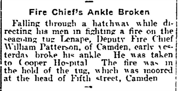 WILLIAM W. PATTERSON was born in Connecticut in May of 1861. He is listed in Camden City Directories beginning in 1878, when he was living at 4 North 9th Street, near State Street. The houses there were renumbered soon after the Directory was published. Camden City Directories beginning in 1881 show William W. Patterson working as a carder at the Camden Woolen Mills. He was then living at 822 North 9th Street. The 1883-1884 Directory has him at 824 North 9th Street. The 1885 edition gives his address at 902 North 9th Street. From 1887 through 1893 he lived at 822 North 9th Street. By the spring of 1894 he had married and moved to 934 Penn Street. He was still an employee of Camden Woolen Mills when, on May 30, 1894, William W. Patterson was appointed to the Camden Fire Department, along with Joseph Logue, david andrews, George Cox, Samuel Curriden, john a. dold, William Jobes, William O. Sawyer, and Albert James. William