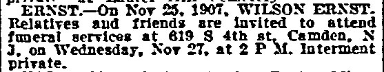GEORGE WILSON ERNST was born of German parents in New Jersey around 1843. He went by his middle name. The 1870 Census shows him and his older brother Frederick engaged in a restaurant. He was still living in Philadelphia when he married Emma Wilkinson in Camden County NJ June 13, 1872. The Ernst family was living at 118 North 2nd street in Philadelphia when the 1880 Census was taken. Wilson Ernst at that time owned a restaurant. He also was involved in construction, and had been active in Camden as early as 1874. Wilson Ernst was active as a builder in Camden in the 1880s. He lived at 312 South 4th Street, and in the late 1880s and early 1890s had offices on Benson Street above 4th Street and at 521 Kaighn Avenue, and a mill at the head of North 2nd Street. In 1886 George Reeser Prowell wrote, in his History of Camden County New Jersey that "Wilson Ernst has been actively engaged since 1876 and about four hundred buildings, chiefly dwellings, attest to his enterprise." Prowell cited Ernst as one of the three most active builders in Camden at the time. Wilson Ernst developed Baring Street, a one block street that runs from Chestnut Street south to Kaighn Avenue between Broadway and South 6th Street in 1888. He was active in Camden as late as 1890. Wilson Ernst passed away on November 25, 1907. |