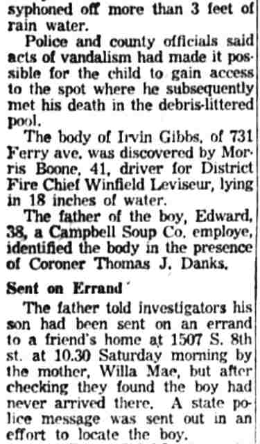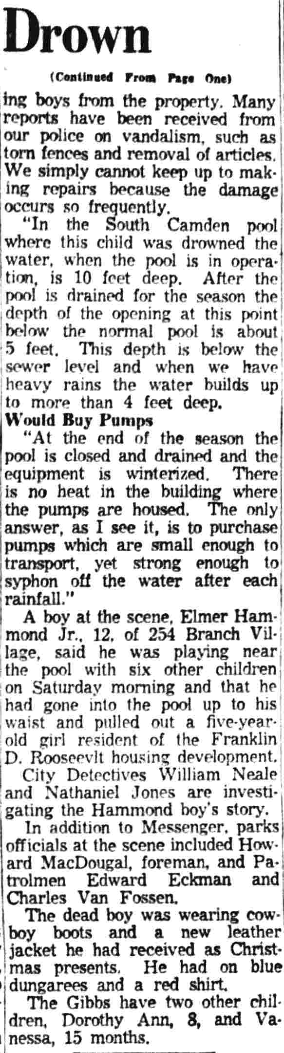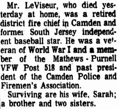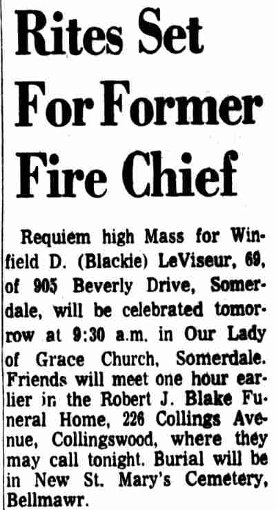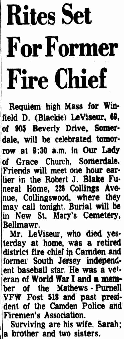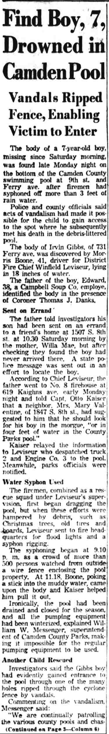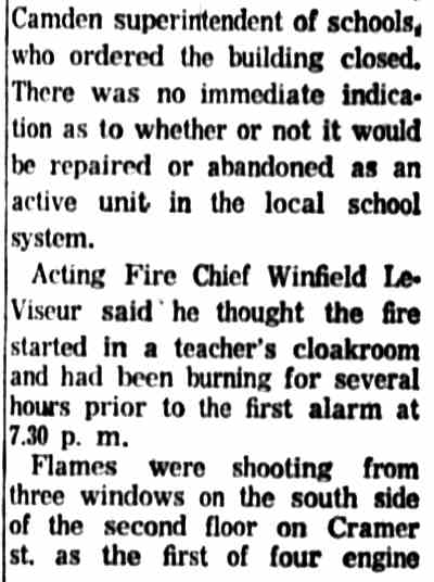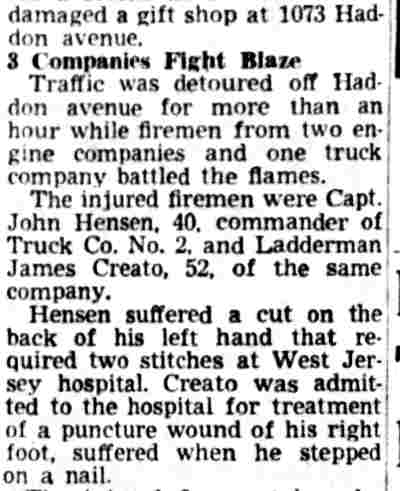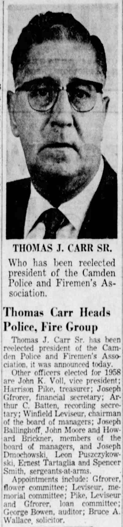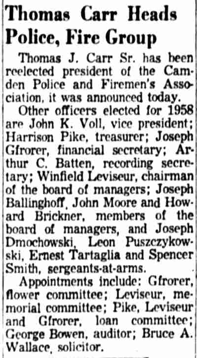 AND FIREMEN WILL ELECT TODAY The Camden Police and Firemen's Association will hold election of officers today at its headquarters, 1175 Whitman Avenue, from 1:00 PM to 9:00 PM. Herbert Bott is unopposed for re-election as president. William Thorn is unopposed to replace Richard Middleton for financial secretary and Walter Vecander is unopposed for the new post of assistant financial secretary. All these are police officers. The police trustees will be named from the following nine candidates: William Marter, George Ward, William Britner, Joseph Shreeve, William Schriber, Joseph Mardino, Joseph Dunnett, Leon Feltz and Russell Young. Two police sergeant-at-arms will be chosen from among Stanley Wirtz, Harry Cattell, Joseph Schultz and George Clayton. Three candidates are seeking the post of vice president, which goes to a fireman. They are William Spencer, Charles Edwards and albert dukes. Warren Rich, a fireman, is slated to succeed himself as recording secretary and Winfield Leviseur is unopposed for the new post of assistant recording secretary, which goes to a fireman. Four fireman trustees will be chosen from ten candidates. They are charles cook, Henry Baumgartel, walter eastlack, Arthur Batten, William Getner, William Toy, lawrence newton, James Young, Russell Anderson and William Taylor. Three firemen are seeking two posts as sergeants-at-arms. They are William Judge, John Mulligan and Furman Price. |