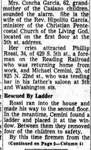 Jose Castiano - Luis Colon - Henry Rodriguez Concha Garcia - Rev. Hipolito Garcia Church of the Living God Mrs. Yolanda Castiano Huberto Casiano - Margie Casiano Jesu Casiano - Yolanda Casianio Mrs. Margaret Young Washington Street - North 22nd Street Philip Rossi - Michael Cimini Charles Cooke Engine Company 1 Winfield Leviseur |