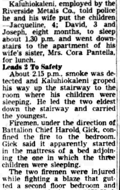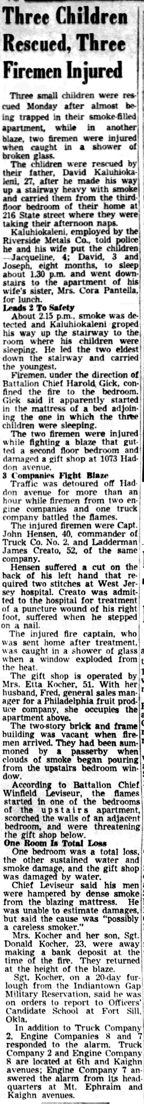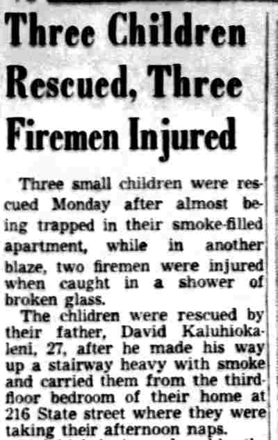 Courier-Post FATHER WHO SAVED his three children is shown holding the tots after the rescue Monday from their smoke-filled apartment at 216 State Street. The children were taking their afternoon nap when the blaze was discovered. From left, Joseph, David Jr., and Jacqueline , are held by their father David Kaluhiokalani.