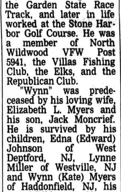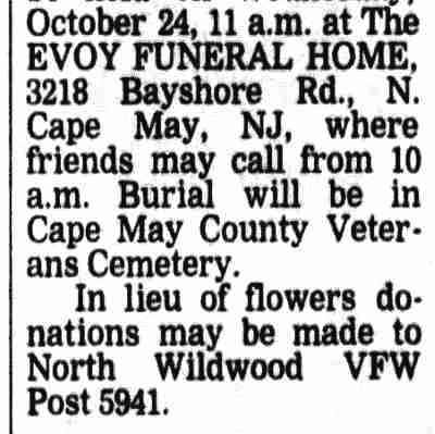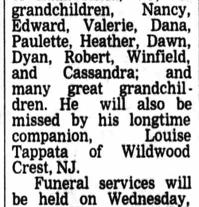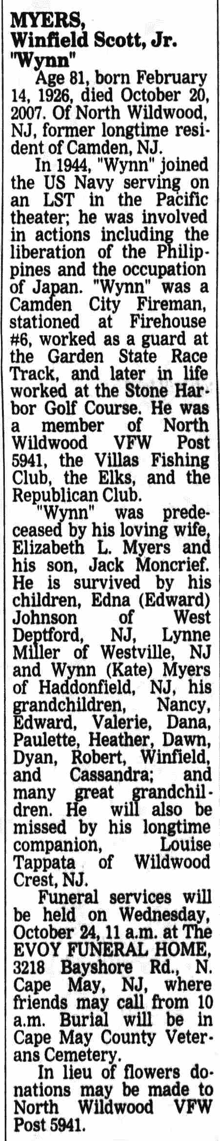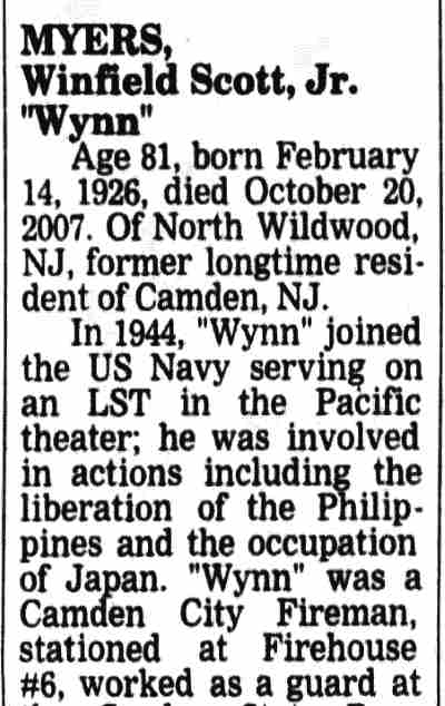WINFIELD SCOTT MYERS JR. was born in Aura, New Jersey on February 14, 1926 to Winfield S. Myers and his wife, the former Sarah Smothers. The family, which included an older brother, Joseph, and two older sisters, was living in Woodbury when the 1930 Census was taken. They moved to Camden not long afterwards. The 1940 Census shows the family living in an apartment at 115 North 3rd Street. By this time the only child at home was Winfield Jr. The Myers had moved to 317 Federal Street by the summer of 1942. Winfield Scott Myers Jr. served in the United States Navy during and after World War II. He returned to Camden when his service ended. His mother passed in 1946. Winfield Scott Myers Jr. was living at 233 Erie Street in 1950. He took the civil service tests for the Camden Police department and for the Camden Fire Department in 1950. Appointed to the Fire Department, he began service on January 1, 1951 and served for over 25 years, much of that time with Engine Company 6. He was married to Elizabeth L. Holland. The lived at 347 Morse Street by 1956 and into the 1960s. Winfield Myers Sr. was residing with them at that address at the time of his passing in 1960. Winfield Scott Myers Jr. was last a resident of Wildwood, New Jersey. He passed away on October 20, 2007. . |