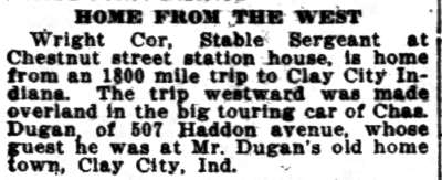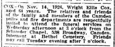 WRIGHT ELLIS COX was born in New Jersey to Edward Cox and the former Caroline Shane in August of 1861. The family resided in Philadelphia when the census was taken in 1880. Shortly after the census enumeration Wright Cox married Martha S. Hales. Two children came of this marriage, only one survived to 1900, a daughter, Ida. Wright and Martha Cox separated by 1900. Wright Cox had moved back to Camden when the City Directory was compiled in 1887, working as a packer and living at 215 Channing Terrace. His daughter Ida was born about this time. By the end of 1890 he had secured an appointment to the Camden Fire Department as a driver. The 1890-1891 City Directory records his address as 220 Washington Street. On May 30, 1894 Wright Cox's brother George P. Cox was appointed to the Camden Fire Department. George P. Cox served as late as 1918, and was a Battalion Chief prior to retiring. When the Census was enumerated in 1900, Wright Cox was separated from his wife. Still working as a fire fighter, he then was boarding at 303 Stevens Street, the home of Henry Colkitt, a wood turner. In 1906 he was at 437 South 4th Street. Four years later he was boarding at 432 South 2nd Street, the home of Reba Harris. By 1914 he had again moved, to 421 South 3rd Street. Wright Cox served on the Fire Department through 1906. On January 1, 1908 he was appointed to the Camden Police Department, where he remained employed through 1924. He had attained the rank of sergeant when the Census was enumerated in January of 1920. He was serving as the stable sergeant for the mounted police in 1921. On January 4, 1922 he was assigned to the mounted patrol, exchanging places with Officer William Greenan, who had been on horseback for the previous 12 years. At that time and through 1924 he lived with his daughter Ida and son-in-law Henry Joseph Gerke at 619 South 4th Street in South Camden. Interestingly enough, in 1920, his wife Martha was also living at that address. It is unknown, however as to whether this marked a reconciliation or was due to some other reason. When the 1926 City Directory was compiled Wright E. Cox was living at 564 Mount Vernon Street. He was still with the police force when the directory was compiled. Wright Cox passed away on November 14, 1926. He was buried at Bethel Cemetery in Pennsauken, New Jersey. Ida Francis Cox married shortly after the 1900 Census was taken. Her husband Henry Gerke had a long career as a fire fighter in Camden and Pennsauken. Her son, Wright Ellis Gerke, served as a B-17 bomber pilot with the United States Army Air Force during World War II. He was killed in action during a raid against Geisenkirchen, Germany in August of 1943. |