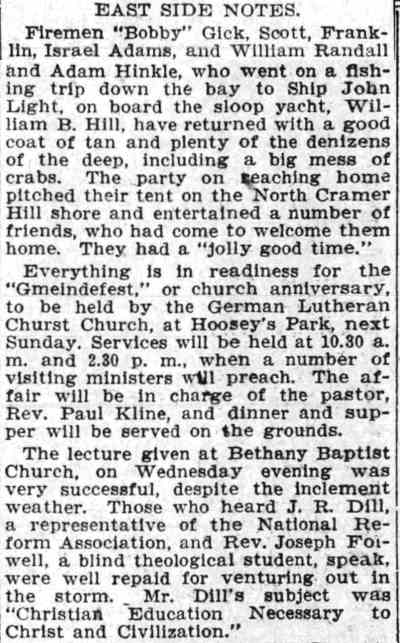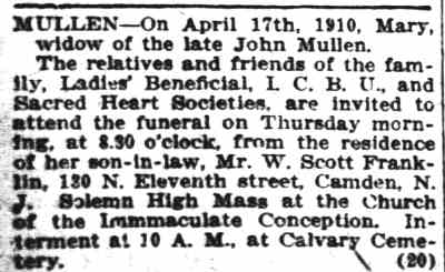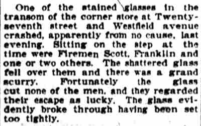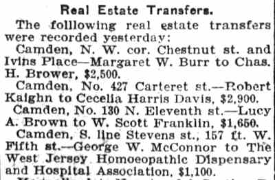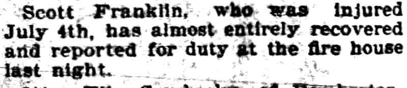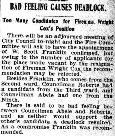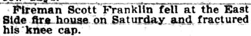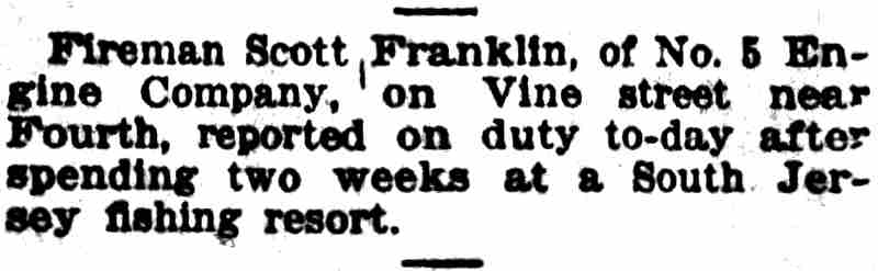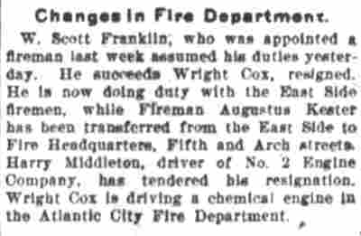 WINFIELD SCOTT FRANKLIN was born on August 20, 1861 to John D. and Maggie Franklin of Stow Creek, Cumberland County, New Jersey. The family moved to Kent County, Maryland prior to the 1870 Census enumeration. The 1878 City Directory shows John D. Franklin with a flour and grain store at 127 Main Street. Winfield S. Franklin was living there and working as a clerk. The business did not work out for long, apparently. By 1880 the Franklins had moved on, to 1032 Carpenter Street. At the time of the 1880 Census he was the youngest of the four children at home, having been born after Lottie, Annie, and Charles. The family then lived at 1032 Carpenter Street in Camden in what was then the Second Ward. His father worked as a miller, his sisters as shoe fitters, with W. Scott and his brother working as laborers. The 1883 Directory shows Winfield S, now going as W. Scott Franklin, and his father living at 833 Penn Street, working as millers for Moro Phillips. Brother Charles, a laborer, also lived at that address. By 1885 W. Scott Franklin had movedout on his own. He was boarding at 756 Federal Street, in 1887 at 589 Mickle Street, then 1888 has him at 823 Penn Street. W. Scott Franklin married his Ella Mullen around 1891. The City Directory show him at 819 Kimber Street. 1892 puts the Franklins at 1137 Maple Street, and 1893 and 1894 at 204 North 11th Street. W. Scott Frankon began to be active politically in the 1890s. He was living at 1042 Carpenter in 1807 and 1898, then moved to 1032 Cooper prior to the compilation of the 1899 City Directory. Winfield Scott was appointed to the Camden Fire Department on November 28, 1899, with the appointment to be confirmed by City Council the next day. He did not begin service with the Fire Department until July of 1901, however. When the Census was taken in June of 1900, W. Scott Frankin was working as a miller in a flour mill, and living with his wife Ella at 1o31 Carpenter Street. City Directories through 1903 give his address as 1031 Carpenter Street. On March 28, 1904 W. Scott Franklin bought the house at 130 North 11th Street from Lucy Brown for $1,650. W. Scott Franklin began his service with the Camden Fire Department in July of 1901, filling the place of Wright Cox, who had resigned. Coz would later be hired by the Camden Police Department. W. Scott Franklin was initially assigned to the then-new East Camden firehouse at North 27th and Federal Streets. In September of 1920 he was promoted to Lieutenant (the equivalent of a modern-day Captain) and was sent to Engine Company 1, 419 Pine street in South Camden. This coincided with the appointment of the five new black firefighters, Benjamin Walters, Walter Carter, george henry johnson, Louis D. Stevens, and Roscoe Tribbett. These were the first blacks to serve with the Fire Department since Pierce Brown, John Wesley Beckett, and William Stanton had served in the late 1870s. Captain Franklin died at his home, 130 North 11th Street, of a stroke on January 30, 1927. He was buried at Calvary Cemetery in Delaware Township (present-day Cherry Hill)., New Jersey. |