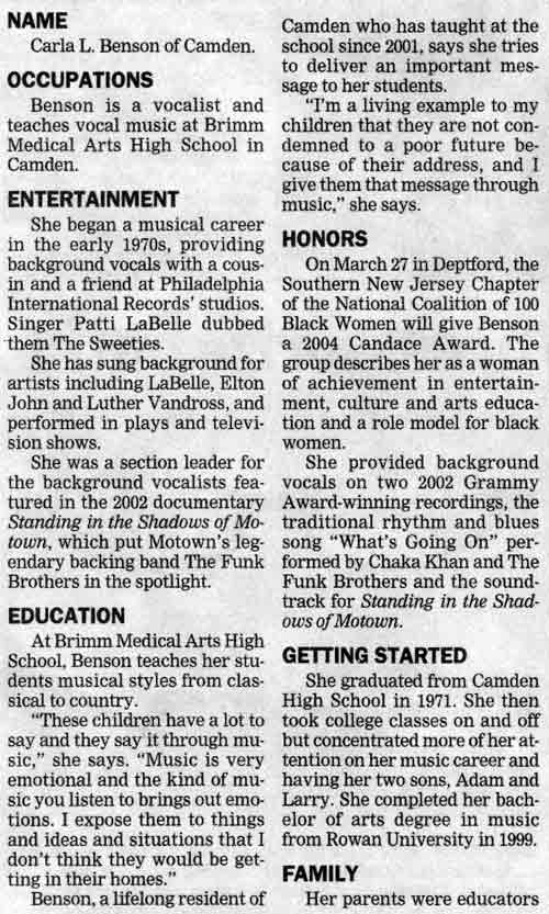Camden-born Carla Benson, through her work as a studio and background vocalist, has been heard on record after record since the 1970s. When the Three Degrees left Philly International Records for greener pastures, Carla Benso, along with Barbara Ingram and Evette Benton stepped up as the label's featured background vocalists. Patti Labelle named them the Sweeties, and the group appeared on record as The Sweethearts of Sigma, referring to Sigma Sound Studios, where they recorded. Carla Benson currently teaches vocal music at Brimm Medical Arts High School in Camden NJ. |