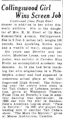 Born in Philadelphia and living in Collingswood when discovered by MGM in 1936, DOROTHY SHORT appeared in local productions at the Camden Elks Home on Cooper Street, the Camden Moose Lodge and elsewhere before going to Hollywood. She will be forever remembered in cult film circles for her starring role as Mary Lane in the 1936 epic, Reefer Madness. She also had a major role in a film of a similar nature Assassin of Youth. Her first screen appearance came in the 1934 production Student Tour, which starred Jimmy Durante, and also featured singer Nelson Eddy. She met actor Dave O'Brien, who appeared with her in her third film, She Married Her Boss in 1935, and in Reefer Madness the following year. The two married were soon married. Later in the 1930s, as "Dave 'Tex' O'Brien", he starred in a number of B-Westerns. The couple appeared in a number of these films together. In 1940 she appeared in Aloma of the South Seas with Jon Hall and Dorothy Lamour, and the following year saw her in Spooks Run Wild with Bela Lugosi, the East Side Kids (aka the Bowery Boys), and the amazing Angelo Rossitto. In 1942, Dorothy Short and Dave O'Brien co-starred in the 1942 Columbia serial Captain Midnight. This would be her last feature film, however she appeared in nine shorts produced by Pete Smith at the MGM studios between 1946 and 1953, all but one of them opposite her husband. Dorothy Short and Dave O'Brien had two daughters, Patty and Pam, The couple divorced in 1953, reportedly because he spent too much time indulging in his hobby—yachting and sailing. Considering the two had co-starred in short films titled I Love My Husband, But! and I Love My Wife But!, its not surprising that their divorce created a flurry of highly imaginative headlines at the time. Apparently Dorothy Short then left show businesses. She passed away in Los Angeles CA on June 4, 1963. |