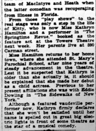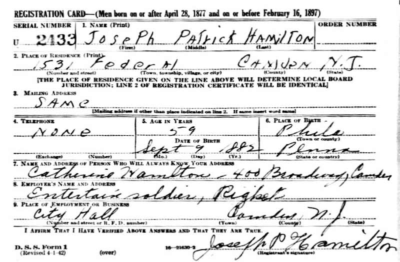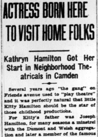 JOSEPH P. HAMILTON JR., known in the world of entertainment as Joe Hamilton, was born in 1883, the third of four children born to Joseph Hamilton and his wife, the former Sarah Anne Reilly. The older children were William and Annie, and Laura May was the baby of the family. In 1905 Joe Hamilton married Laura Cowls, the daughter of Garret Cowls, who was well known in Camden for managing local baseball teams. The marriage produced six children, Francis, Kathryn "Kay", Laura May, Joseph Jr., and Edith. The 1906 Camden City Directory lists both Joseph and Laura G. Hamilton at 210 Friends Avenue, with occupations of actor and actress, respectively. Joe Hamilton worked in vaudeville and for many years in minstrel shows. He is known to have worked for some time with Philadelphia-based minstrel show producer Frank Dumont, and with the legendary Hughey Dougherty. In 1919 he appeared on Broadway in the musical Hello, Alexander, a vehicle for the famed blackface team of McIntyre and Heath. The show ran for 56 performances at the 44th Street Theater before closing on November 22. Changing times, the introduction of movies, and especially movies with sound over time put an end to minstrel shows and vaudeville being mainstream entertainment. There still was work to be had in vaudeville in the 1930s, and Joe Hamilton often teamed up with Walt Stanton, another Camden born-and-raised entertainer, in producing mostly small venue shows and in performance. As part of the Works Progress Administration (WPA) Federal Theater, they perfromed during the 1930s and into the 1940s with other former vaudeville headliners and supporting acts. This unit was disbanded in March of 1943. With the WPA unit and as a pair, Joe Hamilton and Walt Stanton also spent a good deal of time during World War II entertaining wounded servicemen at Fort Dix and in Atlantic City. Daughter Kay Hamilton, a talented singer and actress in her own right, made her debut in 1919. She attended St. Mary's Catholic School, but her real schooling came on stage. A stage veteran by 1927, Kay Hamilton was working that year on Broadway, with Eddie Dowling in the musical Sidewalks of New York. She also appeared in vaudeville, and in nightclubs and theaters. By 1930 the Hamilton family was living at 501 Haddon Avenue, the corner of Haddon and Newton Avenues, directly across the street from what was then Junior High School No. 1. Joseph Hamilton was living at 1533 Federal Street when he passed away in 1946. Joseph Hamilton's grandson, James P. McEvoy served with the Camden Fire Department from 1969 to 1982.. |