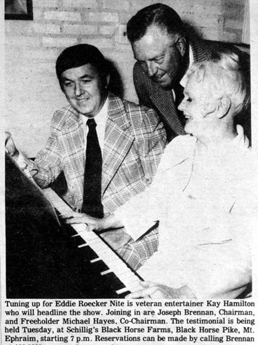 KAY HAMILTON was born in Camden on September 25, 1909, the daughter of minstrel show and vaudeville performer Joseph P. Hamilton and his wife, the former Laura Cowls. Her grandfather, Garrett Cowls organized and pitched for the first baseball team in the city, and managed it for many years as well. At the time of the April 1910 Census, the family lived at 326 Cooper Street in Camden, renting an apartment from prominent Camden physician Dr. Daniel Strock. The family would include five other children, Francis, Laura, Joseph P. Jr; Elmer, and Edith Hamilton. Born Kathryn Hamilton, she would become the third generation of Hamiltons to make a career in show business. As a child Kay "play theater", and would make money by singing in front of music shops to sell sheet music. With show business in her blood, she made her debut in 1919. She attended St. Mary's Catholic School, but her real schooling came on stage. A stage veteran by 1927, Kay Hamilton was working that year on Broadway, with Eddie Dowling in the musical Sidewalks of New York. She also appeared in vaudeville, and in nightclubs and theaters. By 1930 The Hamilton family was living at 501 Haddon Avenue, the corner of Haddon and Newton Avenues, directly across the street from what was then Junior High School No. 1. By October of 1931 Kay Hamilton was making her residence at 1317 Park Boulevard in the Parkside section of Camden. In 1934 Kay Hamilton was a featured performer in the mid 1930s with George Jessel's road show. Kay Hamilton married Peter Trado in the summer of 1936. They continued to work in show business. Peter Trado served in the United States Army from September 1, 1942 through August 31, 1945. The Trados took a shot at Hollywood. Kay had been featured in a 1937 short film called Swing for Sale. Peter appeared in an uncredited role in one film, The Perils of Pauline, in 1947. She later went to Hollywood. By 1956 they had moved to Oaklyn NJ. Peter Trado passed away in 1969. Remaining a resident of Oaklyn, Kay Hamilton Trado passed away on Mach 18, 1998. Kay Hamilton;s nephew, James P. McEvoy, served with the Camden Fire Department from 1969 to 1982. |