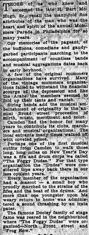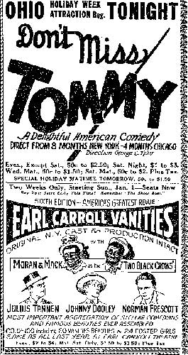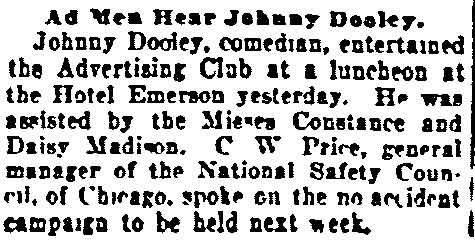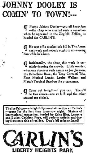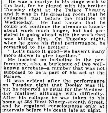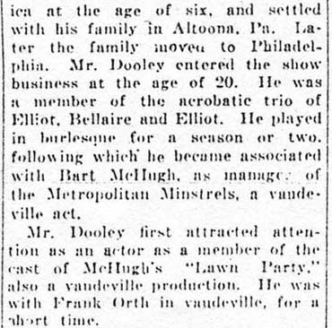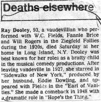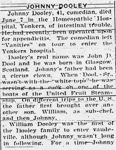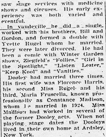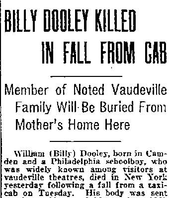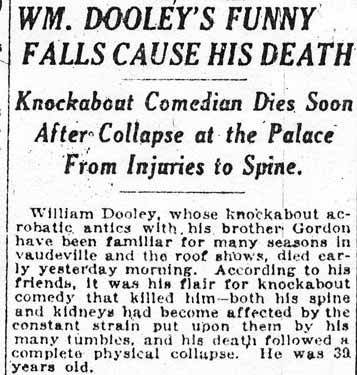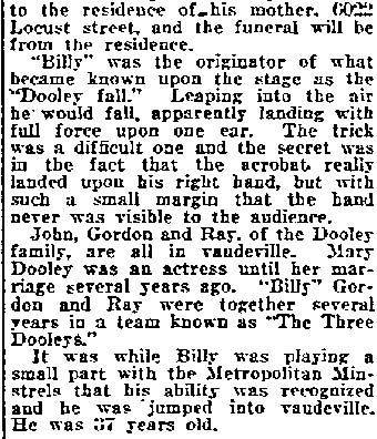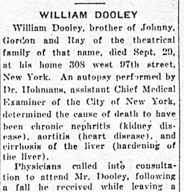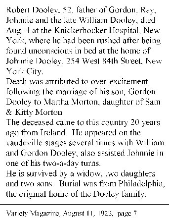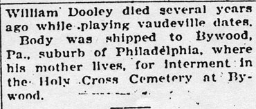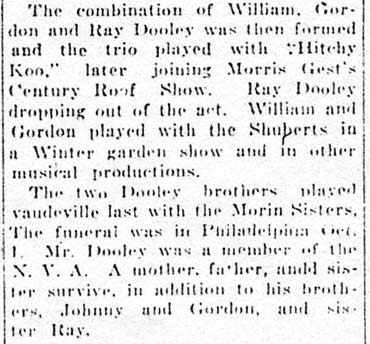 Obituary J. GORDON DOOLEY J. Gordon Dooley, 31, comedian for the vaudeville team of Dooley and Morton, died January 24 at his home In Philadelphia of tuberculosis. Dooley, going from vaude to legit, had appeared in a number of Broadway shows, including "Vanities," Ziegfeld's "Follies," "Honeymoon Lane", and "Hitchy Koo." He had entered vaude as a member of the Dooley' brothers act, working with William, who died September 29, 1921, when he was doing a double with another brother, Johnny, musical comedy comic, who died of appendicitis June 7, 1928. Gordon Dooley married Martha Morton In July, 1922, when she was playing vaude with her parents, Sam and Kitty Morton. Martha replaced her sister Clara when she left the act to do a single. Later Dooley and his wife formed a double act which was working up to time Gordon collapsed. Several months ago both Dooley and Miss Morton were about to appear in a talker short for Columbia pictures. The day before camera work in Camden, N. J., Gordon became so ill that he had to go to his home in Philadelphia. He was never able to return to New York. Ray Dooley (Mrs. Eddie Dowling) was appearing in "Follow Thru" and when her brother's condition became critical she left the show to be at his bedside. There is also another sister, Mrs. George Vaughan (non-pro). The funeral services were held in the Dooley home in Bywood, a suburb of Philadelphia, with interment in Philadelphia. |