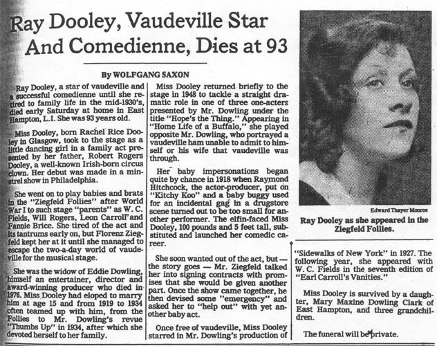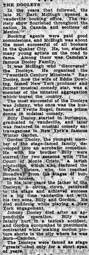 The Dooley's collectively had been a huge success for a brief time in vaudeville, and after the family act broke up several of the family went on to careers individually, with varying degrees of success. Journalist Dan McConnell, who had grown up in the same neighborhood and had worked as a publicist for the Keith circuit in the 1910s wrote about the Dooleys in the late 1930s, as did Gordon Mackay, while working for the Courier. North Camden barber Pat Iarossi, who had a shop for many years at North Third Street told the following to Mackay in early 1938: "I used to cut Ann Pennington’s hair when she was a child," Pat recalled. "And the Dooleys always made my shop their headquarters. Billy Dooley worked for me. The kids, six [ FIVE to be correct- PMC ] of them, trained in a patch we called the 'cow lot’. Rae and Mae were the two girls, while Johnny was the big shot of the boys.” “They used to turn cartwheels right out in the lot there and come into my shop to do a little vocal rehearsing. Ann Pennington was always dancing, you couldn't keep her feet still. I remember one day Ann, Johnny Dooley and a girl named Moore went over to Lubin's in Philadelphia, trying to break into the movies. “Lubin wouldn’t handle them and they all came crying into my shop.” In March of 2007 an e-mail came to this website from John Vaughan, grandson of Mae Dooley and great-nephew of the Ray Dooley and the Dooley brothers. John wrote at length about the his family's show-business legacy. The Dooley's came to America in the late 1800's from Glasgow, Scotland and settled in Philly. The boys were named Johnny, Billy, and Gordon. The girls were named Ray and Mae. Their father, (my great grandfather) was named Robert Rogers Dooley, he was a famous Irish circus clown, and he married Mary Dool, from Glasgow, who was nicked named Mumsie. The five kids all had an act, all did comedy, and the girl Mae, also sang. The went out on the road and toured a lot. Once, when they were all older, they played in Portsmouth, Virginia. Mae fell in love with a man she met there. They decided to get married, Mae dropped out of show business, the two of them moved back to Philly, and they had a baby boy in May of 1917. They named the child William Jonathan Dooley Vaughan. That child would grow up and become my father. That is my connection to the Dooley family. The boys continued as a group and were headliners in their day. Doing mainly slap stick comedy. They stared in many comedy plays plus The Ziegfield Follies, George White Scandals and The Earl Carroll Vanities. We are talking early 1900's till after WWI into the early 1920's. The girl, Ray (also spelled Rae sometimes), split off on her own and became a very big star, also on Broadway as an actress and a comedienne. She performed in many musicals and also in the Follies and Vaudeville.