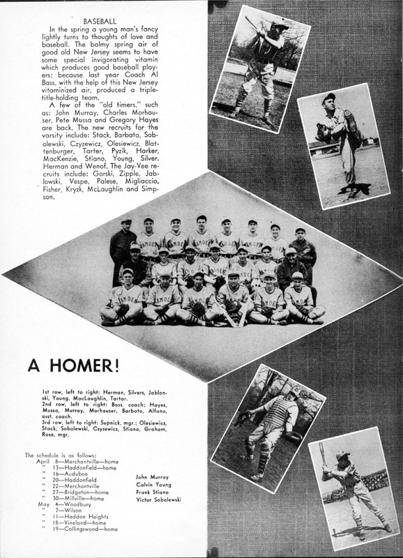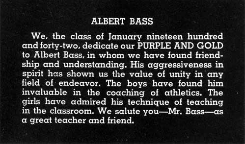 AL BASS played basketball for Camden High School and managed the Purple and Gold baseball from 1939 to 1943. His managerial record at camden high school was 85-15, and during his tenure the team won three city championships and three conference titles. He was also the basketball coach during his last two years at camden high. Al Bass left Camden High after 1943, leaving his basketball team in the very capable hands of his assistant coach, Tony Alfano. The next stop for Al Bass was Woodrow Wilson High School, where he succeeded Grover Wearshing. Al Bass coached the basketball team from 1944 through 1949. Woodrow Wilson was a basketball powerhouse under Al Bass. His record as basketball coach at Wilson was 122-39. His teams were the South Jersey Group 3 champions five times, and won the Group 3 state championship in 1949. His baseball teams were equally successful, with a 105-21 record, five South Jersey titles, four conference championships, and five city-series crowns from 1944 to 1949 in the same six-year span. He remained at Woodrow Wilson until his 1977 retirement as Athletic Director and Dean of Students. |