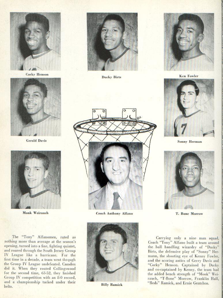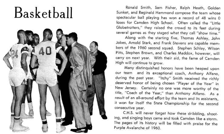 ANTHONY ALFANO taught at Camden High School and Cooper B. Hatch Junior High School for 34 years, from 1942 through 1976. He is best remembered as head basketball coach at Camden High, where he succeeded Al Bass in 1944, after serving as an assistant coach for two years. Tony Alfano was a three sport athlete at Southern High School in Philadelphia, participating in football, basketball, and baseball. After graduation he went to Temple where he played basketball. He was on the national championship NIT basketball team in 1938. Tony Alfano's teams never had a losing season, and compiled a record of 428-129 over 27 years. His 1955 team went undefeated within Group IV, winning its first conference championship in ten years. The Purple Avalanche won consecutive state titles in 1959 and 1960 with a team that featured the great Ron "Itchy" Smith. Many other fine players were coached by him, including Golden "Pete" Sunkett, who had a long career with the Camden Police Department and Sam Fisher Jr., who went on to the Camden Fire Department. Clarence Turner, himself a highly successful basketball coach at Camden High, served as an assistant under Alfano. After leaving Camden High he worked at Villanova University in the college library. Inducted into the South jersey Basketball Hall of Fame in 1982, Anthony Alfano passed away on January 6, 2005. |