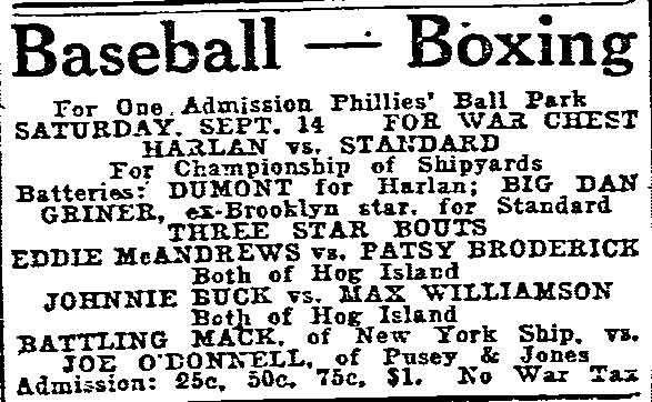 Charley Humes Roxie Allen Mickey Blair Shamus Maguire Eddie Chaney Pee Wee Ross Jackie Hindle Watson Finch George Abner Nick Nichols Dixie Allen Mike O'Dowd Benny Leonard Pete Herman Jimmy Wilde Gene Tunney John Smith Lee Smith Lou McFarland Higgins & Kaplam Tommy James Sgt. Ray Smith Pose Robinson Willie Davis Harry Smith Jim Kelly Temple Theatre Newt Blanchard Broadway Theater Convention Hall Plaza Hotel Roy R. Stewart Mike Brennan Tommy Loughran Jack Dempsey K.O. Joey O'Donnell Frankie Conway Willie Spencer Charlie Daggert Jimmy Rafferty Eddie "Kid" Wagner Young Sherlock Eddie Forrest Battling Nelson Willie Fuller Joey O'Connor Chick Hunt Eddie Melson Joe "Kid" FIsher Harry "Dick" Donohue Nick Nichols Eddie Prince Johnny Sapio Weber's Hof Brau Young Joe Grim Edward Garrity George Murphy Eddie Tighe Richie Joehner Jimmy Tighe Jimmy Jordan Eddie Douglas Bobby Graham Steve Jackson Frankie McLaughlin Neil McLaughlin Johnny "Homo" Bryan Duncan Carswell Jimmy Dean Jack Dean Theo Ellick Joe Spearing "Red" Haines Standard Theater Everett Joslin John Taylor Joey Powell Soldier Freeman Victor King Augie Oswald Charlie Mack Battling Mack |