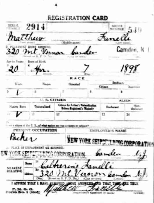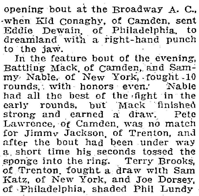 BATTLING MACK was born Mattheo Fanelli in Pennsylvania on April 7, 1898 to John and Catherine Fanelli. The family appears in various records as Fanelli, Fannelli, Fanello, and Fannelo. Although records for the time that he fought are woefully incomplete, his skill and success in the ring are perhaps best evidenced by the length of his career. He was active in the ring from 1917 through 1926. Late in his career Battling Mack founded a gym near South 3rd and Walnut Streets, where many of Camden's finest boxers of the era trained. It was at this gym in 1930 that Arnold "Jersey Joe Walcott" Cream was first introduced to the fight game. As Battling Mack, Matthew Fanelli turned professional in 1917, and fought five times in Philadelphia, and possibly twice more in Baltimore that year. With the America at war, he found work at the New York Shipbuilding Corporation shipyard on Broadway at Morgan Street, where he was employed when he registered for the draft on September 12, 1918. He was then living with his widowed mother Catherine Fanelli at 320 Mount Vernon Street in South Camden. The 1920 Census shows Matthew Fanelli still living with his mother at 320 Mount Vernon Street. Also at that address was older brother Rocco Fanelli, a member of the Camden Fire Department, younger brother Charles, and five younger sisters, Mary, Pauline, Millie, Rosie and Marguerite, as wells as Mary's husband John Mucci and their children Agnes and Rafaella. Matthew Fanelli served as a member of the Camden Police Department in the early 1930s, joining shprtly after the April 1930 Census. Last a resident of Pennsauken, Matthew Fanelli, aka Battling Mack, passed away in August of 1971. Battling Mack's brother, Charles Fanelli, fought as Charley Mack in the 1920s through 1930. |