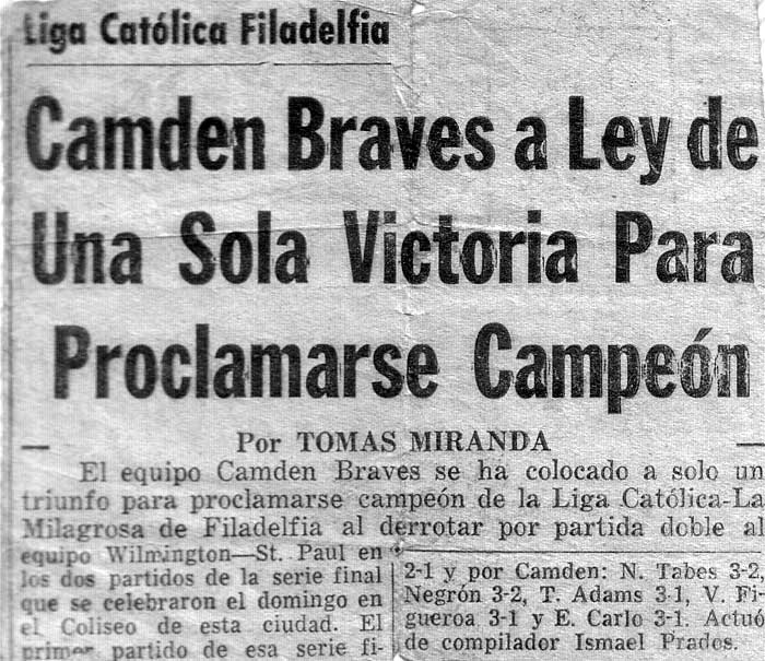 The CAMDEN BRAVES baseball club, which as of 2006 is in its second season in the Tri-State National Adult Baseball Association league, is one of the newest chapters in the long and glorious history of Camden baseball. An early Puerto Rican baseball club was the North Camden Lions. This club was succeeded by the North Camden Braves, organized by Popsy Rodriquez. They would play other Puerto Rican teams from Philadelphia on Sunday in the Pyne Point Park from the 1960s into the 1980s. Contests would attract large crowds, and everyone followed the outcomes, even if they couldn't attend. Crowds attracted vendors and wagering on the outcome. No one wanted to miss out on the excitement. Besides Popsy Rodriguez, other Braves players included Manolo Figueroa, Eligio Ortiz, Felix Colon, Juan Ortiz Sr., Junior Fantauzzi, Israel Tubens, and Hector Ortiz. The Braves were the AA Champions of the local Catholic League in 1964 and 1965. The original Braves team disbanded during the 1990s, but reorganized in 2005. David Ortiz is the current manager, and three of his family are current Braves players. |