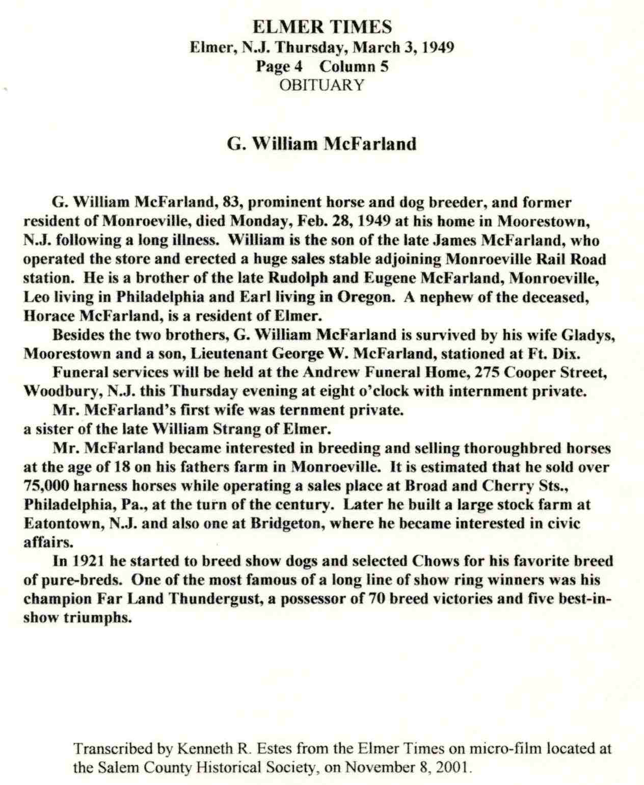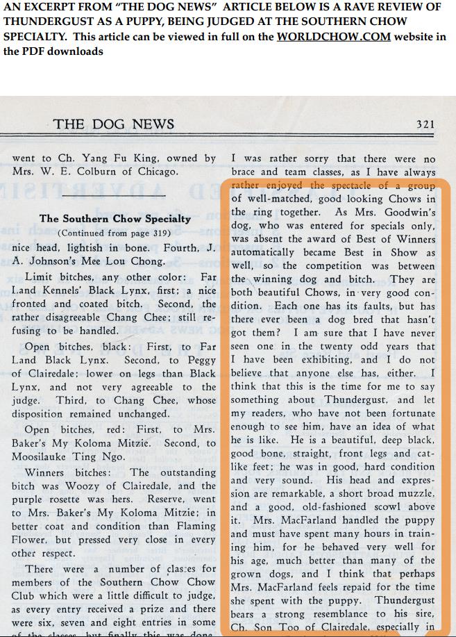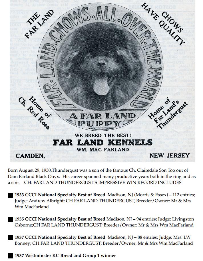 ENTRY WINS IN DOG SHOW New York, Feb. 11.-A Camden entrant was one of the winners in yesterday's Westminster show at the Madison Square Garden, greatest of all events in dogdom. Showing his best against the sternest kind of competition, Champion Far Land Thundergust, a beautiful, well conformed dog owned by Mrs. William MacFarland, Camden, carried off the best of breed award for chows. "Gust" as he has come to be known amongst the exhibitors at this "world series" of American dog shows, was, in the words of rival handlers, "at his best." While a large first-day crowd applauded his selection, the brawny, heavily-coated black son of Son Too-Far Land Black Onyx, now in his sixth year and cutting a wide swath among the chows, seemed to sense that it was his day. He went through his routine without flaw, his coat in such excellent condition that even laymen marked him out. Only champions compete in this group, and one of them, Shanghai Chief, owned by Mrs. Barney J. Houston, Cincinnati, pushed Thundergust for the award. But the Camden winner, bidding for his third Westminster ribbon, and fresh from his latest triumph as best of breed at Baltimore, was not to be denied. The Westminster is, as customary, a three-day fixture. On Wednesday night six dogs who have gone triumphantly through the various breed and group competitions will be judged for the supreme honor, best in the show. The dog which attained this peak last year is back in the running. It is Nunsoe Duc de la Terrace of Blakeen, a white poodle. In the last 30 years of the Westminster, only three dogs have been able to win the best of breeds prize two years in a row.. |