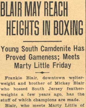 FRANKIE BLAIR was a professional boxer from Camden NJ. Born Frank J. Tenerelli on August 20, 1909, he grew up on South 4th Street in Camden. The Tenerelli famil, which included older brother Michael and sisters Nettie and Mary, lived at 833 South 4th Street. At 839 South 4th Street lived the Scola family; their son, Vincent Scola, gained notoriety through his involvement in organized crime in the 1930s and 1940s. Frankie Blair grew into a 5'7" welterweight. He turned professional in August of 1933. Although www.boxrec.com shows his first pro fight in January of 1934, local newspapers report his first fight on August 2, 1933, a first round knockout of Camden boxer "Reds" Foy at the outdoor arena on the Airport Circle in Pennsauken NJ. According to www.boxrec.com, from January of 1934 on he ran up a 7-2 record against mostly insignificant opposition, except for one loss against veteran Cuban welterweight Relampago Saguero. He fought in Camden's Convention Hall in May of 1934, a fight arranged by Camden ex-boxer Frankie Rapp. Around the end of 1935, Frankie Blair began training at the legendary Stillman's Gym on 125th Street near Seventh Avenue in New York, where he trained alongside fighter such as Lou Ambers, Henry Armstrong, Erich Seelig, Tony Canzoneri, and Leonard DelGenio. He fought 29 times over the next three years, mostly in New York City. Frankie Blair fought three times in Camden during this period, scoring wins against Tony Falco, Freddy Fitzgerald, and Johnny Duca. After losing his last 5 tests in 1938, Blair split in four fights the following year. He was then inactive, except for a one fight comeback against Harry Dublinsky in 1944, after which Frankie Blair called it a career. Compiling a record of 24 wins, 17 losses and two draws, Blair was a boxer, not a big puncher, as evidenced by the fact that only two of his wins were by knockout. Frankie Blair had a great chin, only one of his losses coming by technical knockout, to the great Filipino fighter Ceferino Garcia in June of 1938. Garcia would fight for the welterweight title a few months after stopping Blair, and lose, but would move up to middleweight, becoming the world champion in October of 1939. Frankie Blair returned to Camden, and by September of 1939 was the proprietor of a bar called The Upset Club, at 950 South 5th Street, the corner of South 5th and Walnut Street. He was out of the bar business by 1947, however, and was working as a salesman, according to the 1947 Camden City Directory, and living at 833 South 4th Street. He later moved to Haddon Township NJ, where he is listed in the 1959 New Jersey Bell Telephone Directory. He was living there as late as 1977. Frank Tenerelli died in August of 1988. Frankie Blair's older brother Michael fought professionally as Mickey Blair. A super featherweight, he compiled a record of 3 wins, 6 losses, and 1 no decision. Mickey Blair was often front page news for activities outside the ring in the late 1920s, 1930s, and early 1940s. Mickey Blair was shot to death in November of 1941 at a bar he operated in Atlantic County. Even with the war on, his murder produced headlines for a few years after his death. |