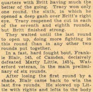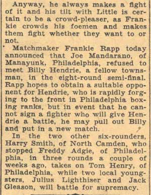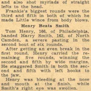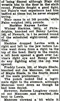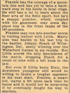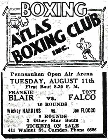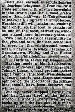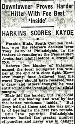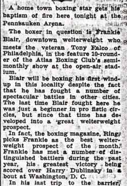 DANGER IN HEINSMAN TIFF Frankie Blair, South Camden Italian, today is the toast of Little Italy's boxing fans. Frankie, brother of Mickey Blair, who ruled South Jersey feather weight ranks several years ago makes his second bow in professional boxing circles next Friday at Charley Grip's Pennsauken Township open-air Arena. Blair is slated to meet Lou Heinsman of Lindenwold, in the opening six-rounder of a card which is featured by a double-wind- up. In the final set-to, Johnny Duca, Paulsboro "Paralyzer," meets Charley Fusel of Philadelphia, and Johnny Peppe, also of Philadelphia, faces Joe Smallwood of Wilmington. Del., in the first-half of the double-bill. Both are eight-rounders. Although Blair made an impressive showing in his professional debut here by knocking out "Reds" Foy, another local boxer, in less than a round, the South Camden Italian is flirting with danger in signing to meet Heinsman. Lou was kayoed by Terry McGovern in four rounds in his first fuss, but Heinsman displayed good hitting power in each hand, several times rocking McGovern before the latter dropped Lou for the full count. However, Heinsman was handicapped after the first round as he broke a small bone in his left hand when he clipped McGovern on the jaw. Heinsman was late in reporting and did not get an opportunity to bandage his hands and his left fist was nearly twice its normal size when the glove was cut off after the match. The injured member now is as good as ever and when Matchmaker Lou McFarland offered Lou a tiff with Blair, Lou jumped at the chance to meet the downtown young-ster, Blair knows more about the finer arts of the game, but Heinsman hits just as hard as Frankie and the bout, should be a slugfest through-out. Two other six-rounders also will be staged. "Mushy" Green of Camden, takes on Joe Lawson, also of Camden, while Marty Little of Waterford, clashes with "Sonny" Carley of the United States Marines Corps. |