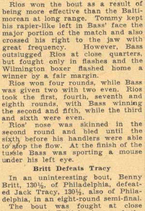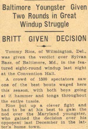 Rios Gains Verdict Over Sylvan Bass in Feature Boxing Bout at Civic Hall WILMINGTON FIGHTER TAKES 4 OF 8 ROUNDS Baltimore Youngster Given Two Rounds in Great Windup Struggle BRITT GIVEN DECISION |