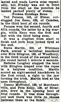 TOM RYAN Johnny Duca, Paulsboro "Paralyzer," won the referee's decision over Carl Fuser, of Philadelphia, in the last half of a double-windup held at Grip's Pennsauken Township Open-Air Arena last night. About 1000 fans saw the hard-hitting Italian win six of the eight rounds, lose one and spit even in another. Duca dropped Fuser for a count of nine in the sixth, a short right to the pit of the stomach sending the Philadelphian to the mat. Johnny tried valiantly to finish his groggy foe, but Fuser covered up and held on to last out the round and also remain on his feet till the bell ended the one-sided skirmish. A straight left started the gore flowing from Fuser's nose in the first round and also had the claret streaming from the organ in the last two rounds. Johnny also opened a cut under Carl's right eye In the seventh and the Philadelphian was badly marked at the finish. Duca did not show a mark of the encounter. Duca did not become serious till the start of the fifth, but from that time on won every round by a commanding margin. He won the second and third by a fair shade and split even in the first, with Fuser having the better of the fourth round. The fact that Fuser refused to "dog it" after being dropped in the sixth had most of the crowd pulling for him to stick it out till the end. And although Duca belabored him with everything in the last two sessions, a body attack in both periods causing Fuser's knees to ·sag on several occasions, the bushy-haired Philadelphian fought back as well as he was able and was given a good hand for his for his gameness. Both boys scaled in at 155 pounds. Pepe Beats Smallwood A 19-pound pull in the weights proved too big a handicap for Joe Smallwood, 151, of Wilmington, to overcome in the eight-round semi-final against Johnny Pepe, 170, of Philadelphia. It was an uninteresting match, Pepe trying to fight inside with Smallwood tying him up continually. However, when Johnny did get inside he did enough damage to win five rounds. Smallwood won the second and third rounds by a shade and split even in the second frame. The Wilmington youngster suffered a cut on the nose in the sixth. At the weighing-in exercises yesterday, the weights of the two boxers were given as Smallwood, 156; Pepe, 170. Making his debut as a boxer, Joe Montana, 181, South Camden's wrestler, outpointed Mike Sullivan, 200, of Atlantic City, in a special six-round-er. Montana won the first, second, fourth and sixth rounds, while Sullivan won the third round by a big margin, and also carried the fifth. Sullivan, who had the usual roll of fat around his mid-section, made a clown fight of it. Montana, regarded as a good puncher, failed to rock Sullivan at any stage of the fuss. Little Given Verdict In an interesting match, Marty Little, 142, of Waterford, eked out a close decision over Terry McGovern, 136, of the U. S. Marine Corps, in the third six-rounder. The last round decided the issue as Little had won the second and third rounds and McGovern won the fourth and fifth, while the first was even. Little was the hardest hitter and spilled McGovern in the second with a left hook to the jaw, but Terry was up before a count could be started. Joe Lawson, 118, of Camden, outpointed "Mushy" Green, 115, also of Camden, in the second six-rounder. Lawson finished strong, winning the last three rounds along with the first. Green won the second and third rounds. The bout was marred by frequent clinches. Frank Blair, 145, of Camden, and Eddie Faris, 143, of Wilmington, Del., fought a great draw in the opening bout of six rounds. Both boys won two rounds with two even. Blair won the first and fourth rounds, Faris won the second and fifth, while the third and sixth were even. They stood toe to toe almost from start to finish and both were tired at the end. Blair was bleeding at the nose at the end and Faris sported a "mouse" under the left eye, Any decision other than a draw would have been unfair to both youngsters, who were in there to annihilate each other and who tried their best to turn the trick. |