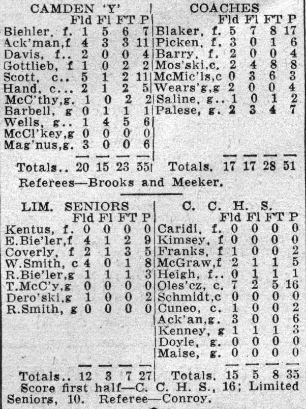 'Y' VARSITY CONQUERS COACHES TheCamden Y.M.C.A. varsity quintet took the measure of the South Jersey Coaches by 55 to 51 last night in a free-scoring tussle at the "Y" court. Fields and fouls were plentiful during the tussle with the Y.M.C.A. outfit racking up a total of 20 baskets from scrimmage and 15 of 23 foul attempts. Bill Ackerman and Al Scott led the attack for the winners with 11 counters apiece, while Art Blaker, Camden High mentor, was the big gun on the offense for the Coaches with five fields and seven fouls for 17 counters.