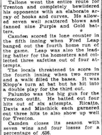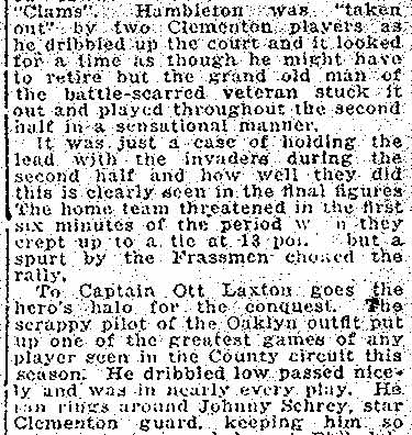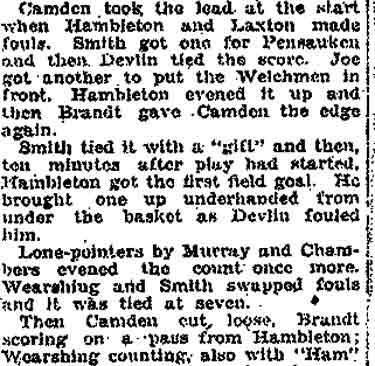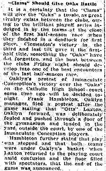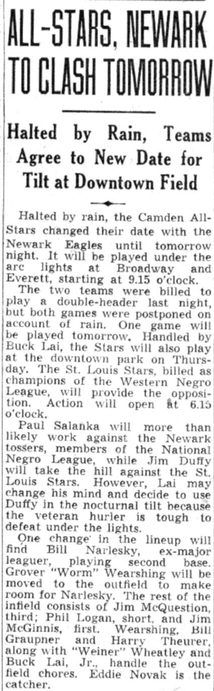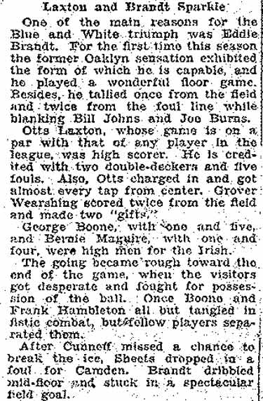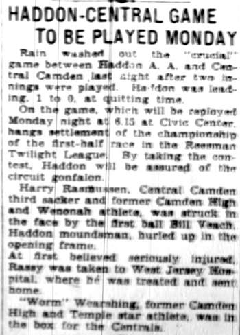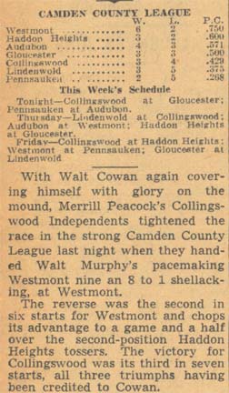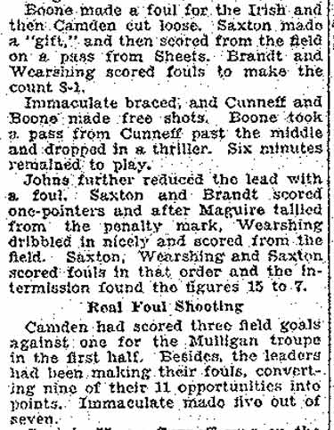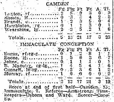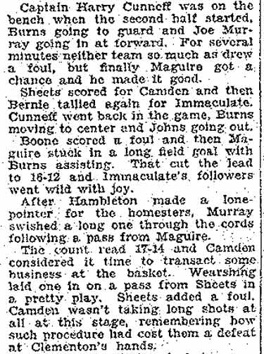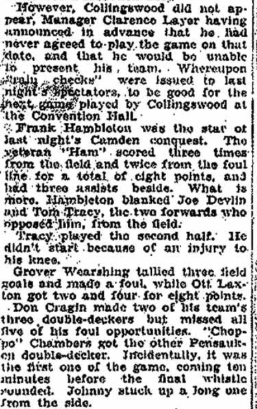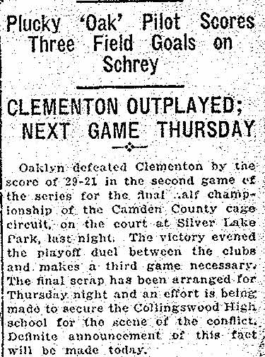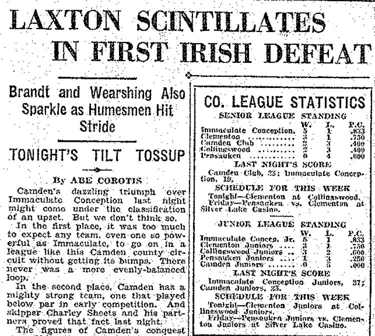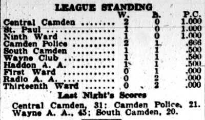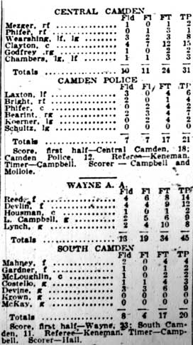 Central Camden beat the Camden Police quintet to make it two straight in the Municipal basketball circuit at Convention Hall last night. By blanking Clarence Phifer, and holding Ott Laxton down to six points the Central outfit spiked the Coppers’ attack. Clayton and Grover Wearshing did the heavy work for the winners. Clayton held Phifer without a field shot and tallied four times from the field. Wearshing bagged a trio of double-deckers. Gus Koerner was ejected from the game when Referee Keneman ruled him off the floor for abusive language. The Wayne dribblers battled down South Camden under a 46-20 score in the other combat Jimmy Reed and Devlin were the bright stars for the winners.